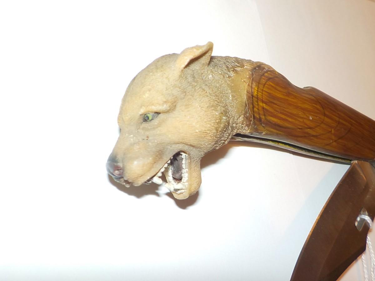 The art work is amazing of the bear, handle fits in hand well with a 5 in very shar blade. Not made in usa, however the 4 00 gauge steel blade, wood handle of cherry wood and head combo of a very solid wood and composite very hard. 4 day inspection allowed.