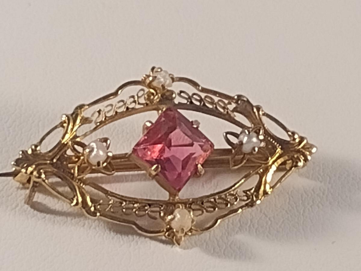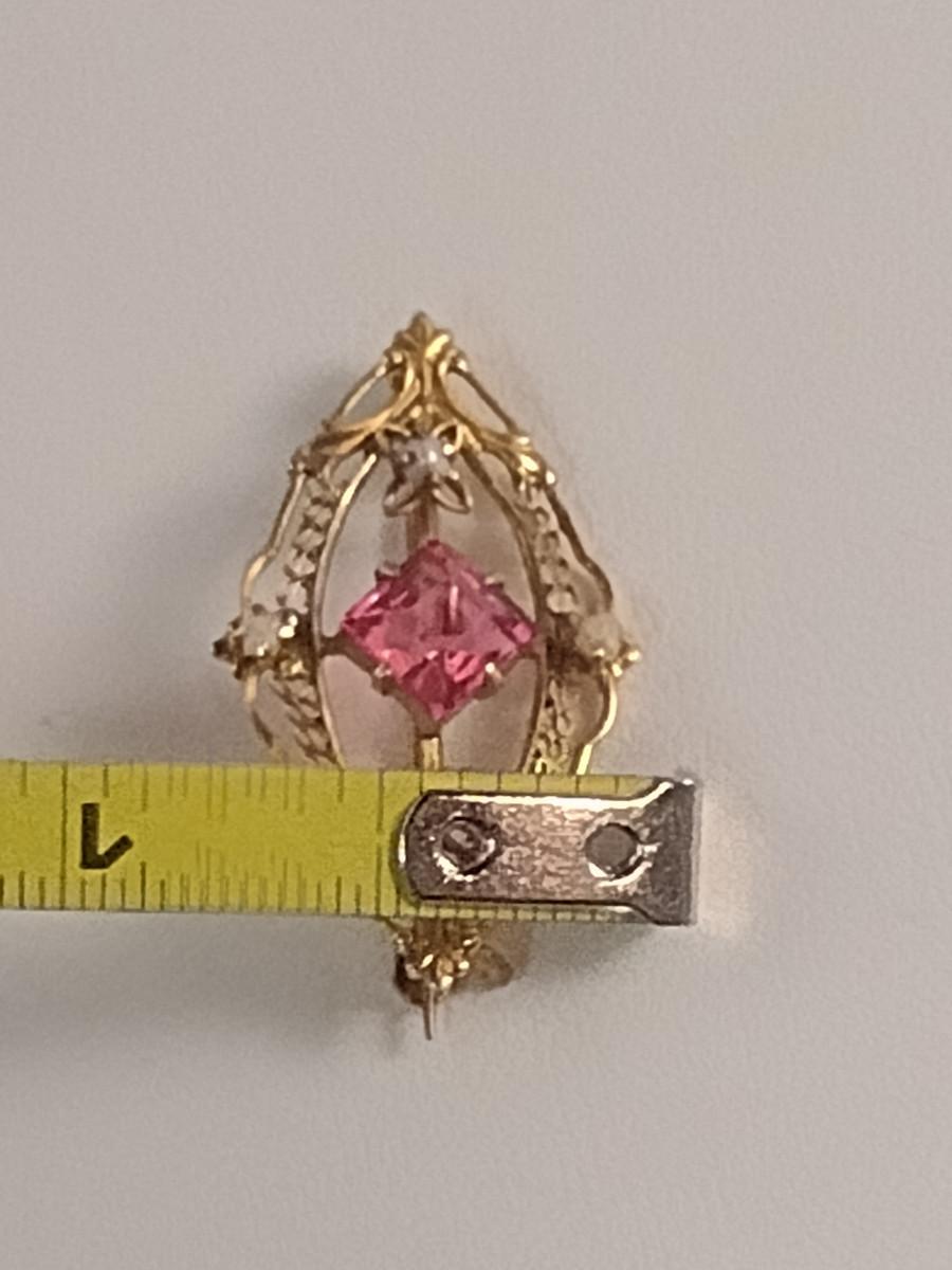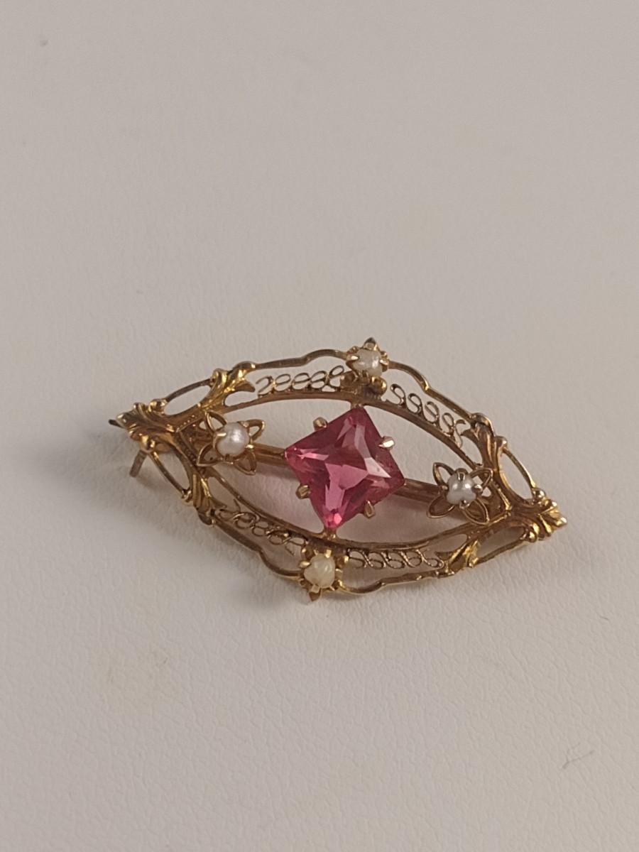 10 Karat Yellow Gold Brooch with Pink Stone and Seed Pearls - Approx Total Weight 2.2 Grams (#36)