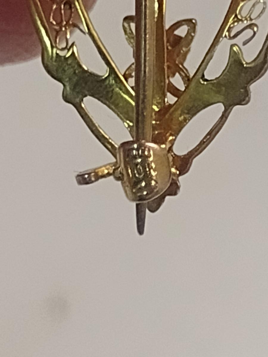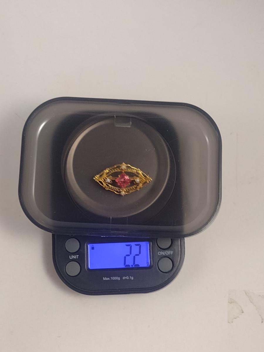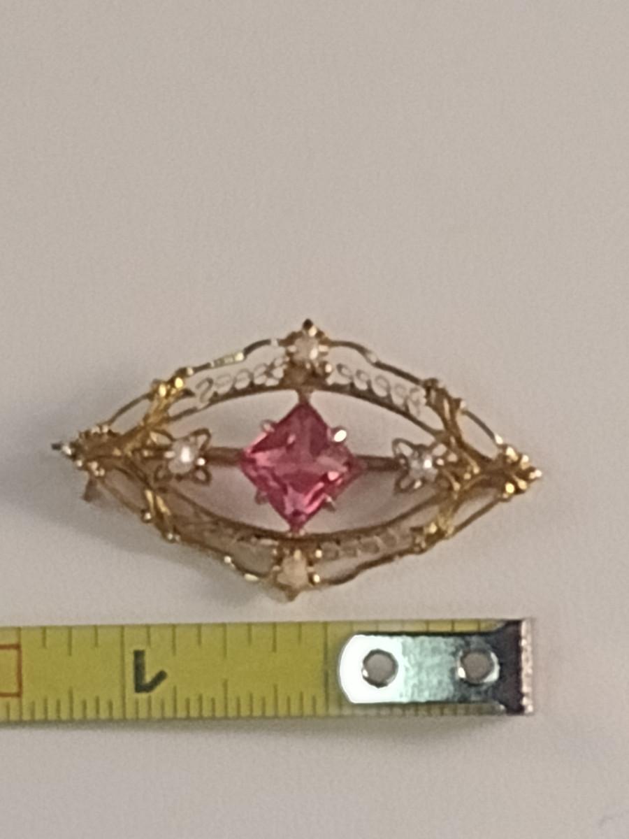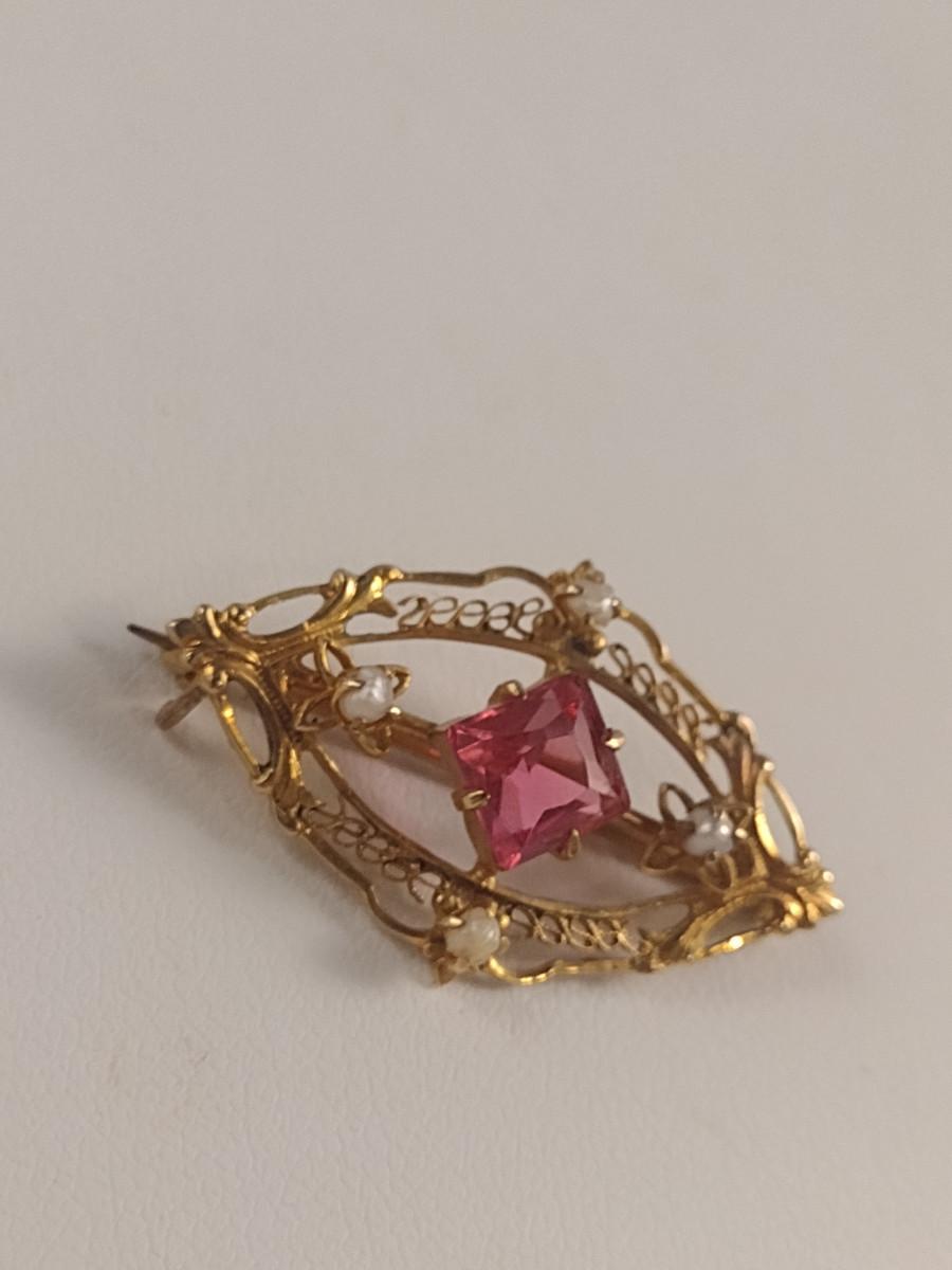 10 Karat Yellow Gold Brooch with Pink Stone and Seed Pearls - Approx Total Weight 2.2 Grams (#36)