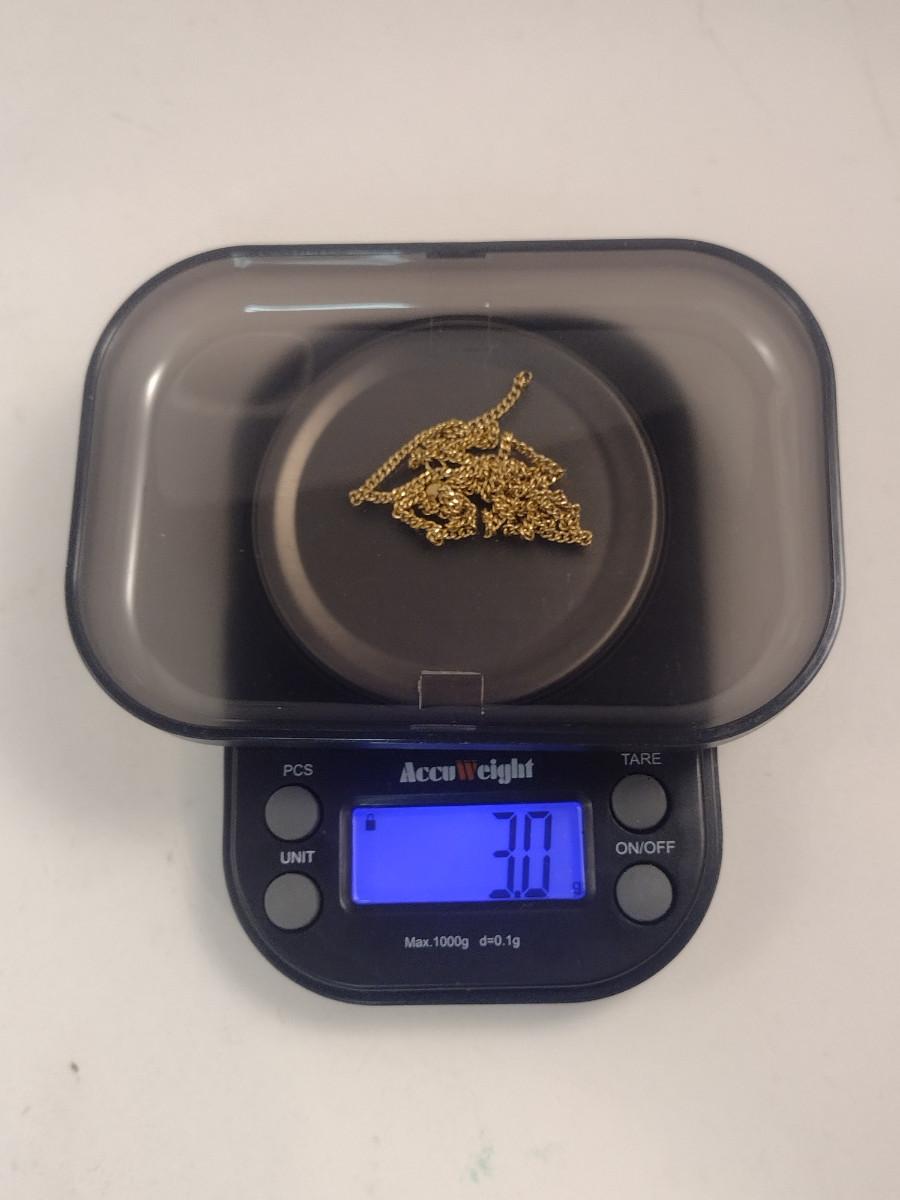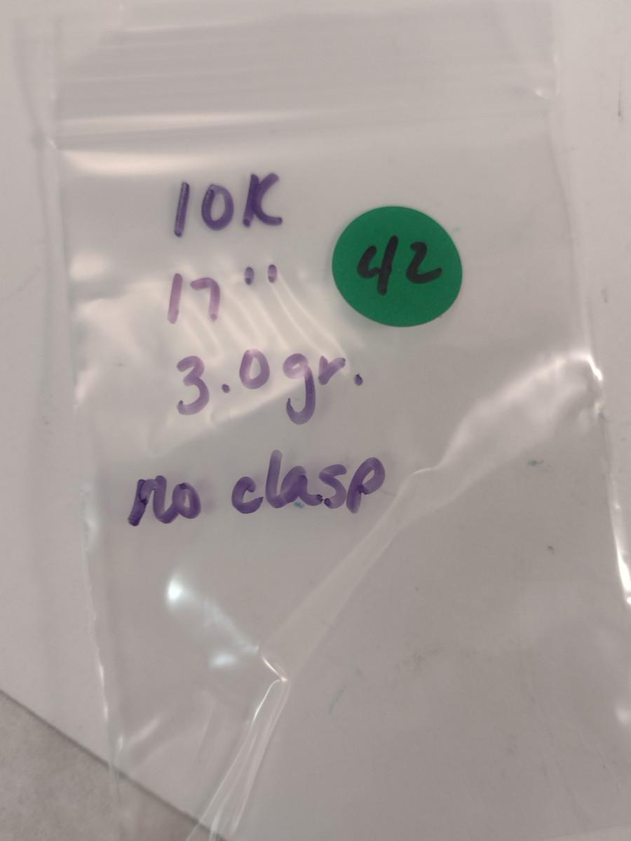 10 Karat Yellow Gold Chain Necklace- Needs Repair- Approx Weight 3.0 Grams (#42). Item has no clasp. Approx 17" long.