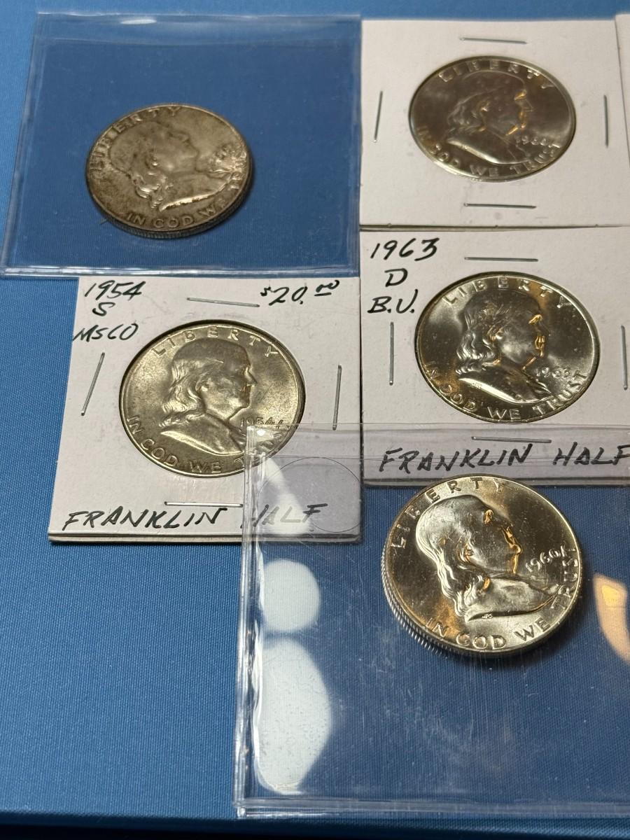 (10) UNCIRCULATED CONDITION FRANKLIN SILVER HALF DOLLARS BAG #16 RECEIVE ALL AS PICTURED. $6 DOMESTIC SHIPPING.