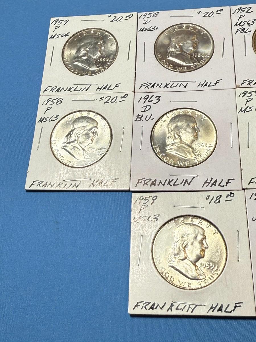 (10) UNCIRCULATED CONDITION FRANKLIN SILVER HALF DOLLARS BAG #15 RECEIVE ALL AS PICTURED. $6 DOMESTIC SHIPPING.
