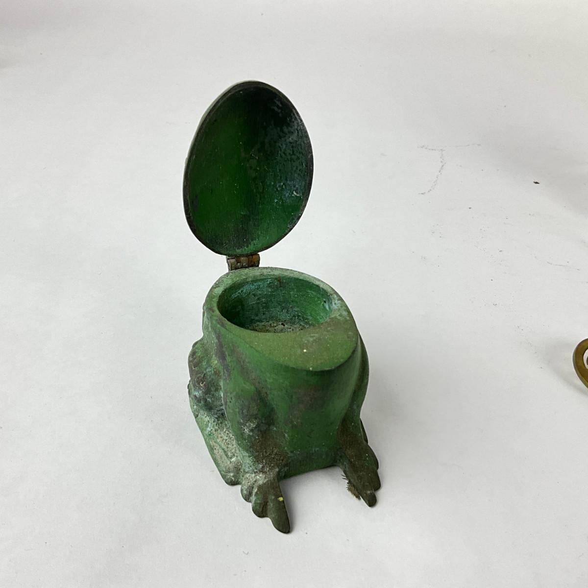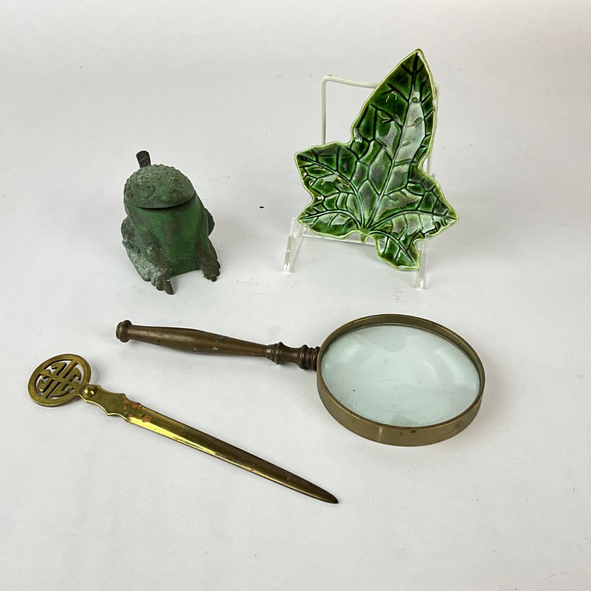 1082 Vintage Metal Frog Inkwell, Magnifying Glass, Brass Letter Opener with Plate