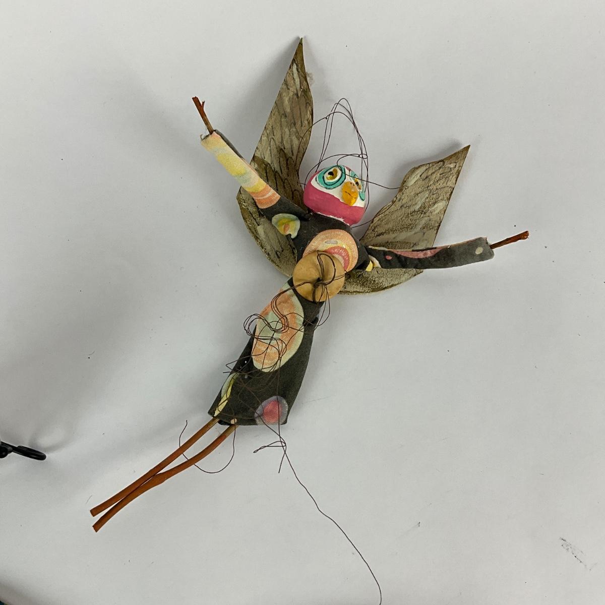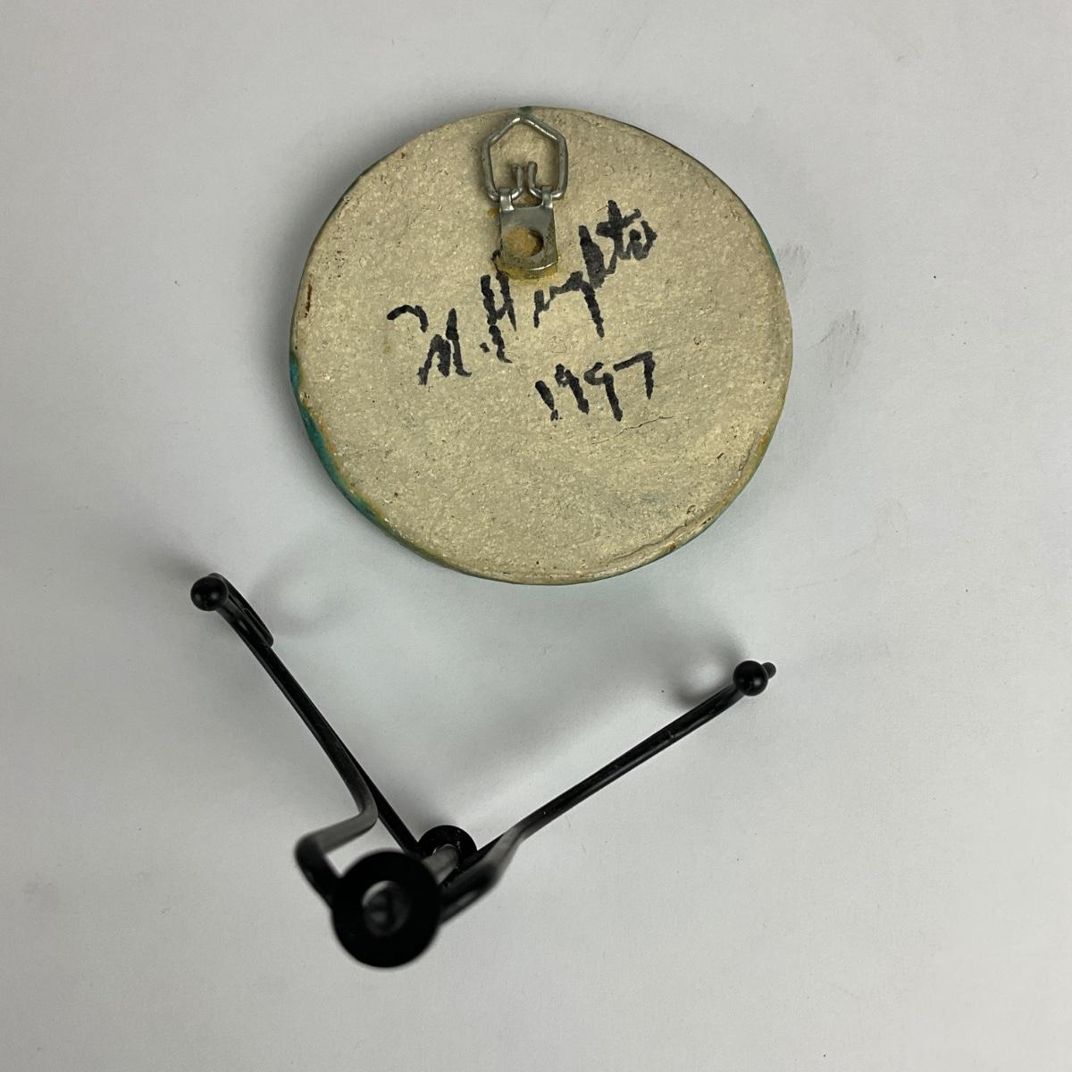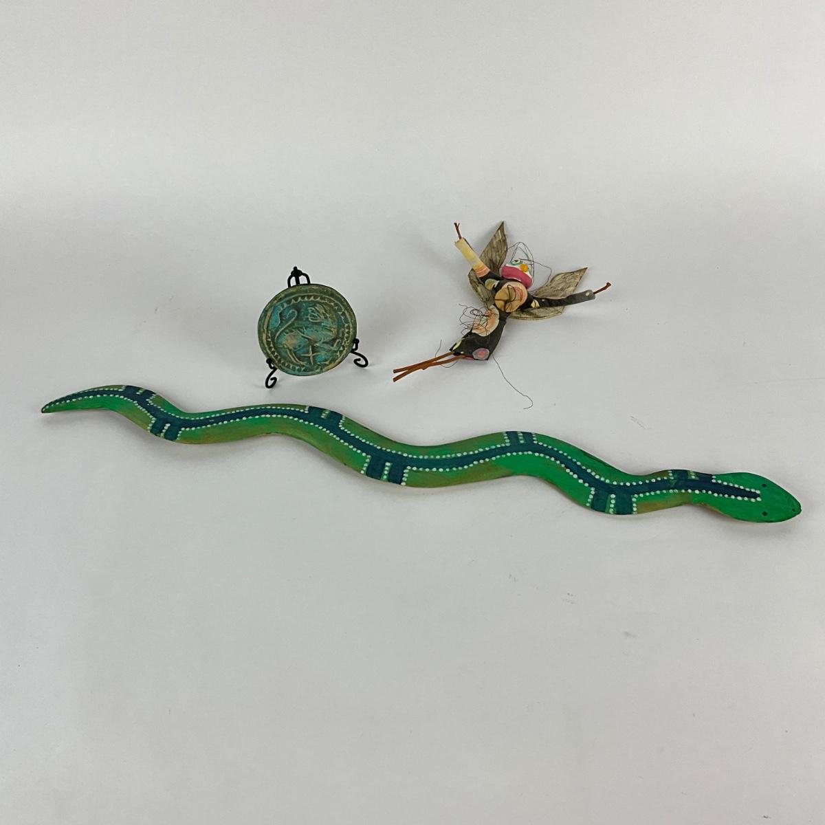 Painted wooden snake, small clay medallion signed on back 1997 and hand-made doll