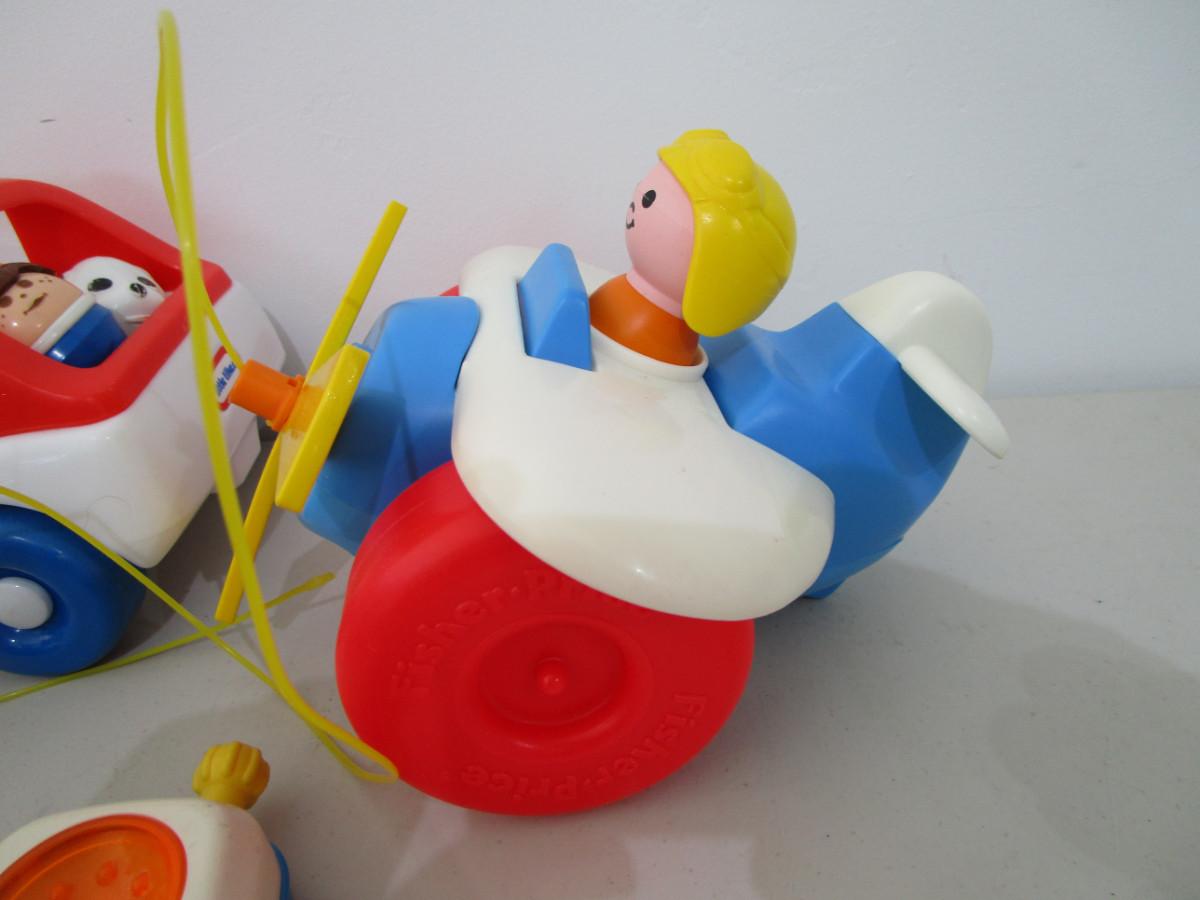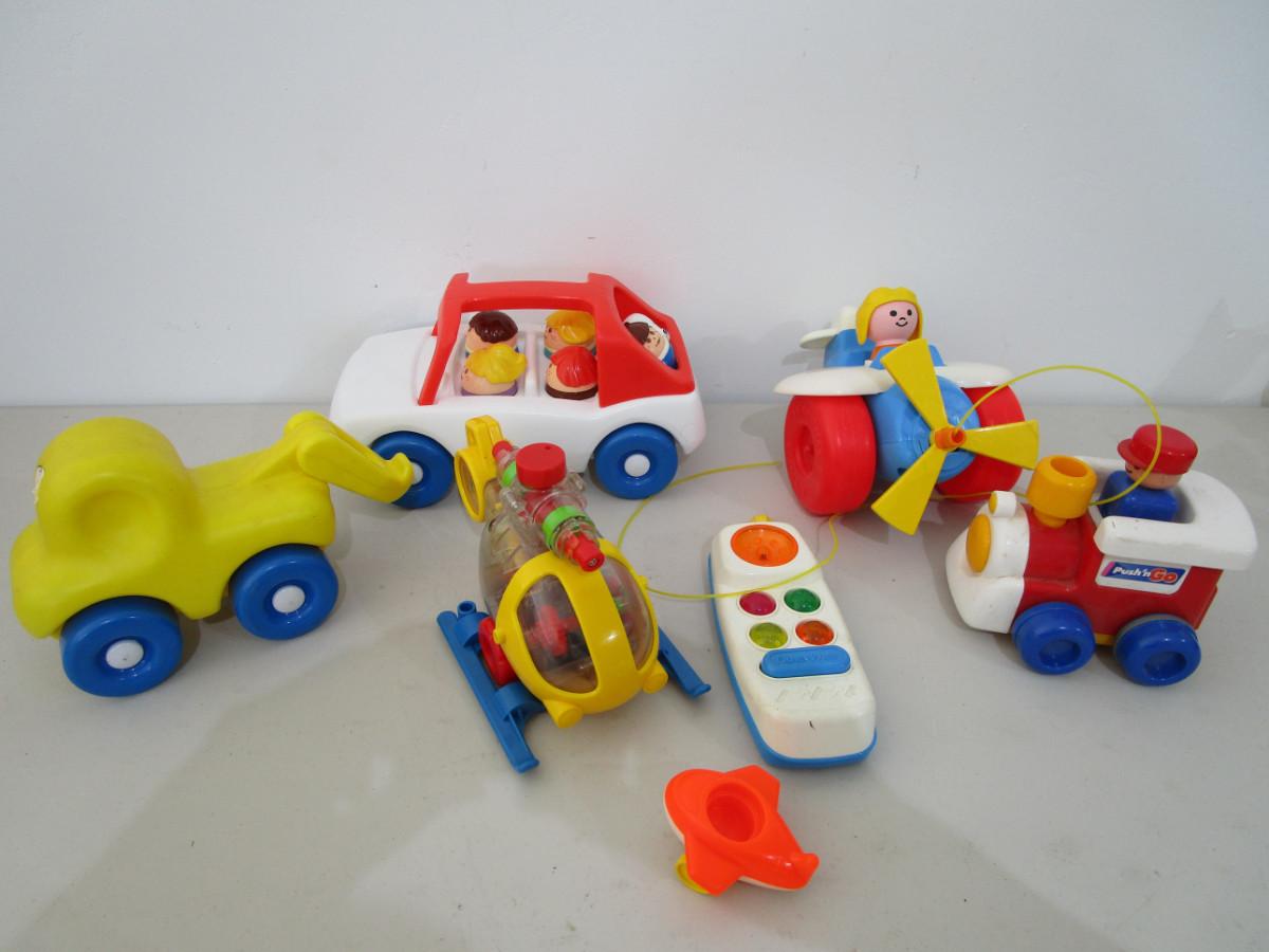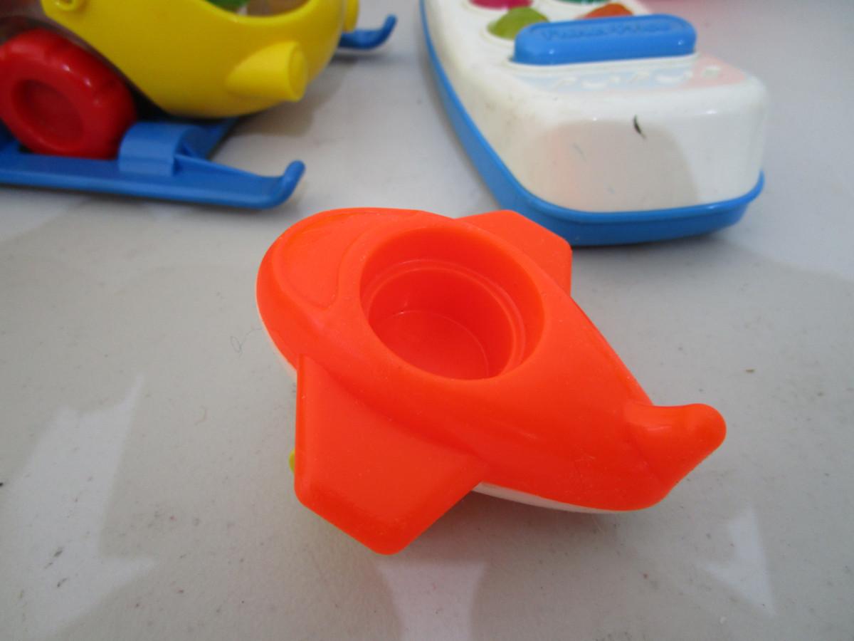 Little Tikes car, Fisher Price plane, Little Tikes truck, Fisher Price phone, and helocopter (missing some parts), train engine
