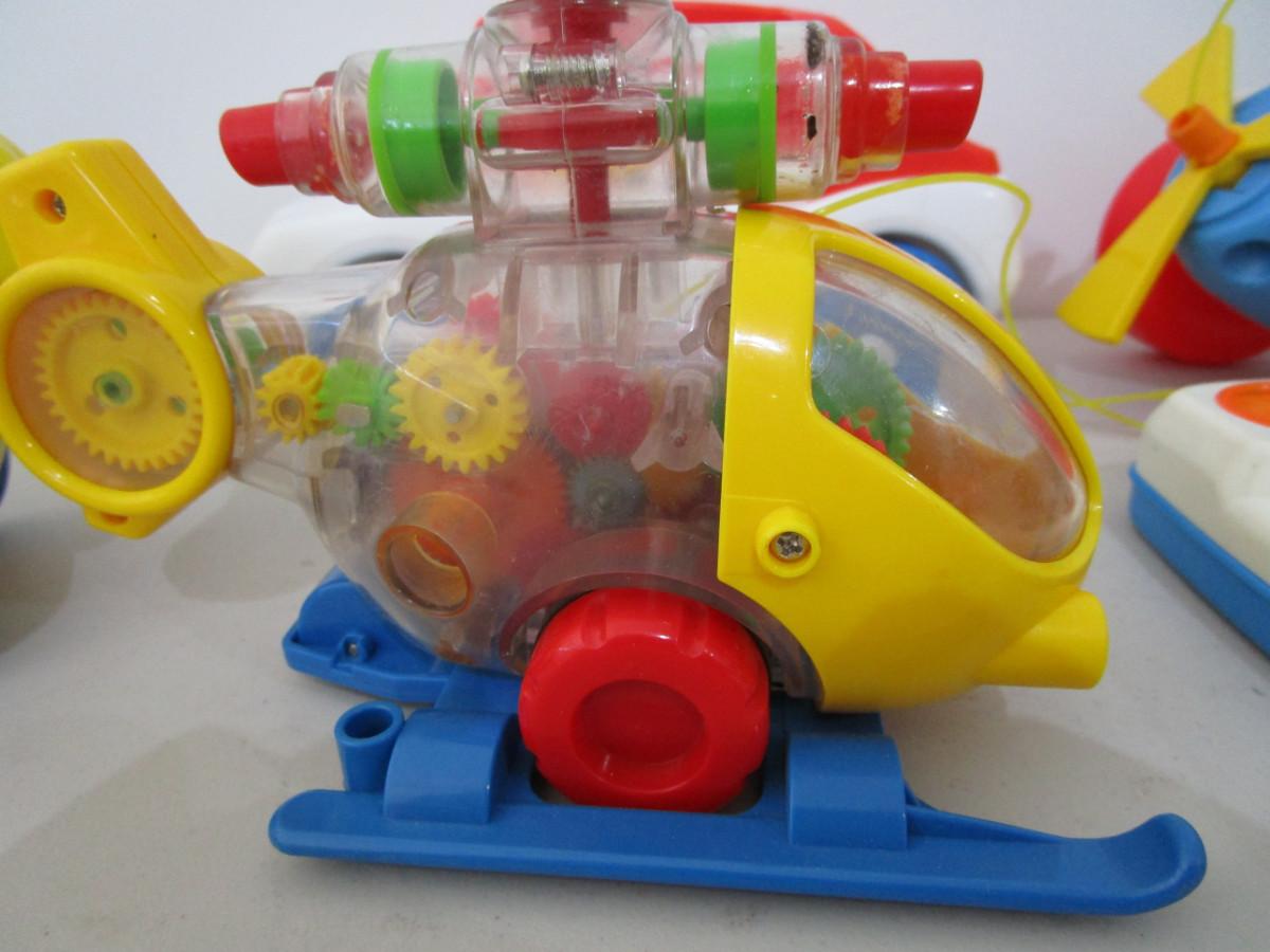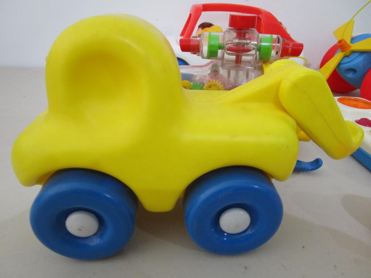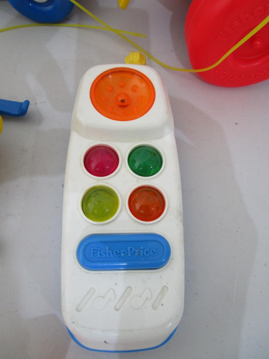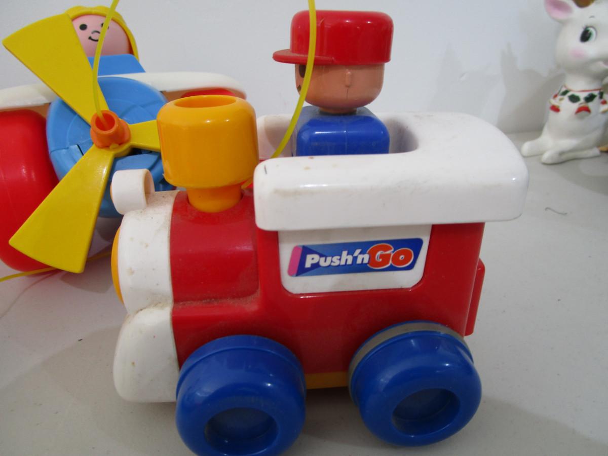 Little Tikes car, Fisher Price plane, Little Tikes truck, Fisher Price phone, and helocopter (missing some parts), train engine