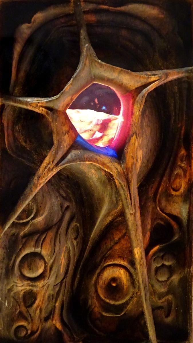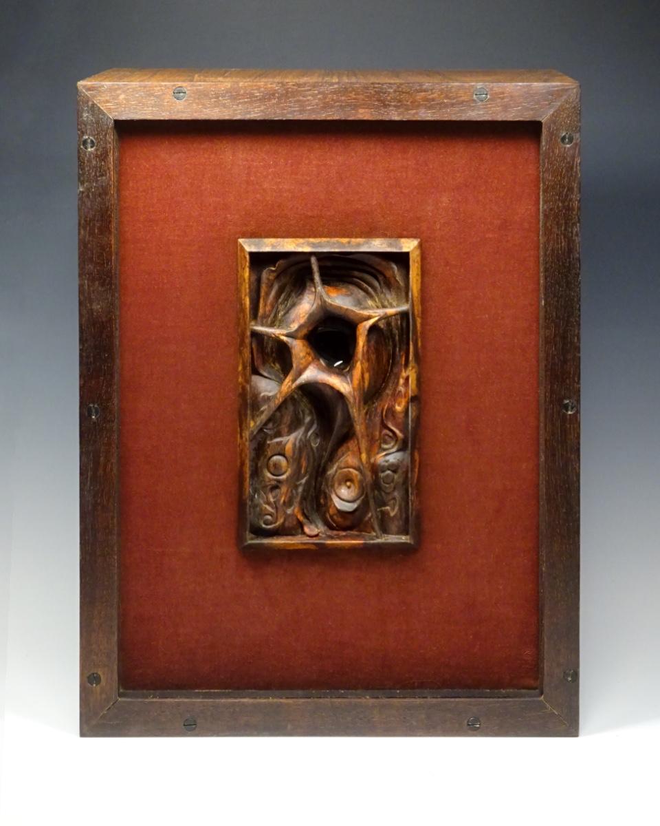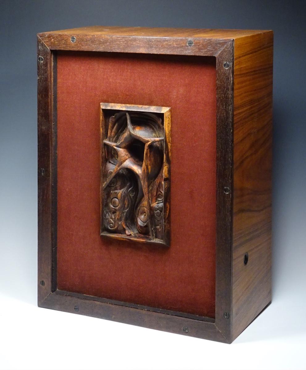 Torrid, 10w x 13.5h x 5.5"d carved rosewood, mixed media in wooden box.