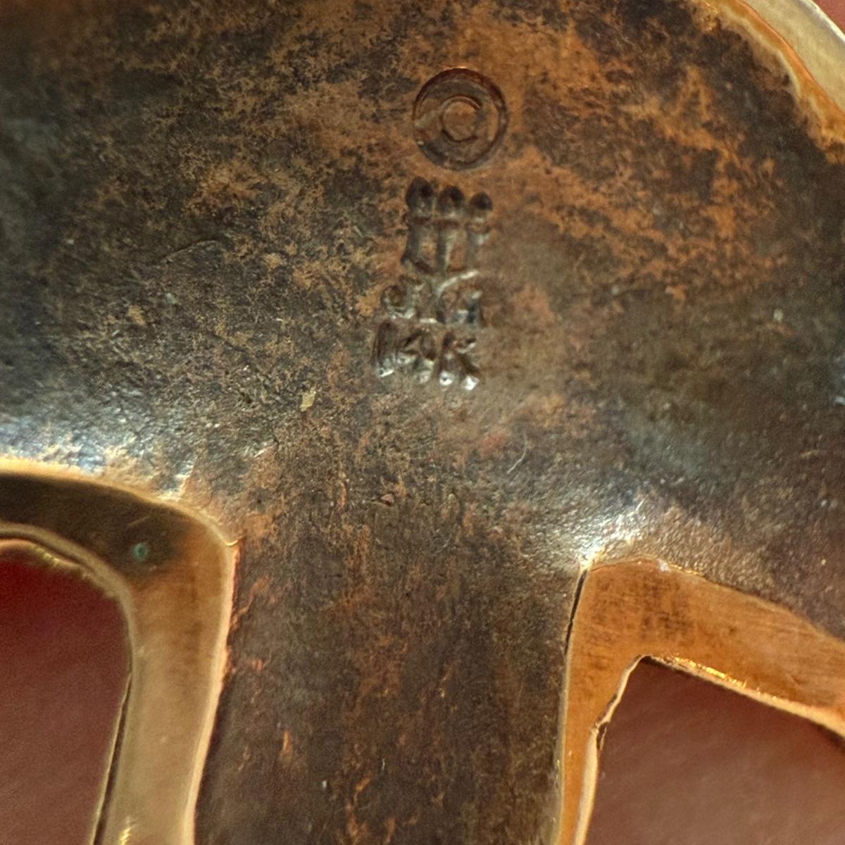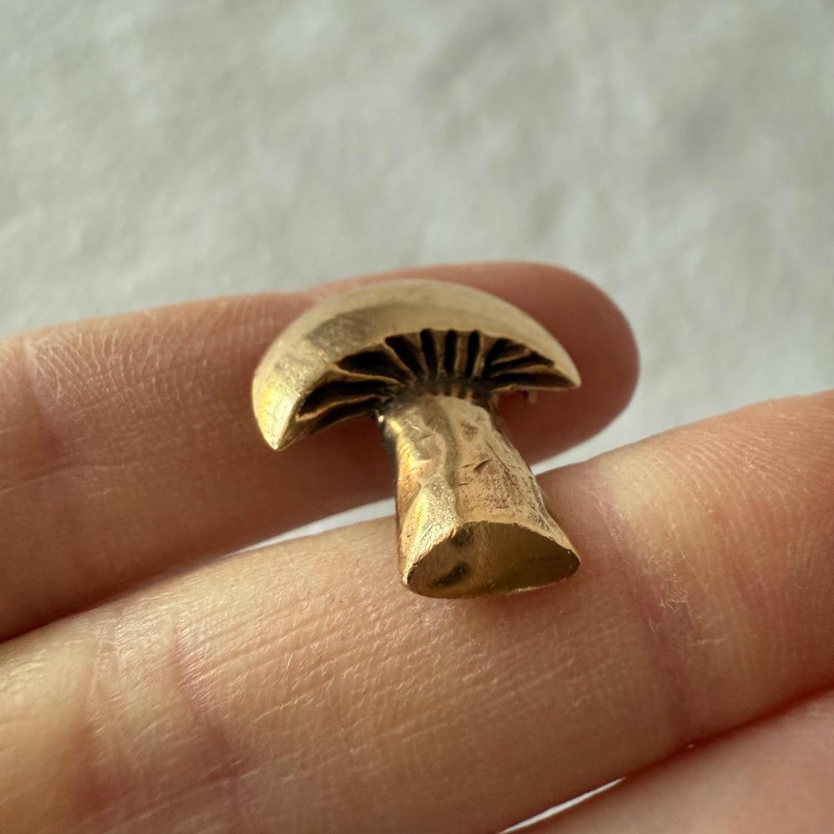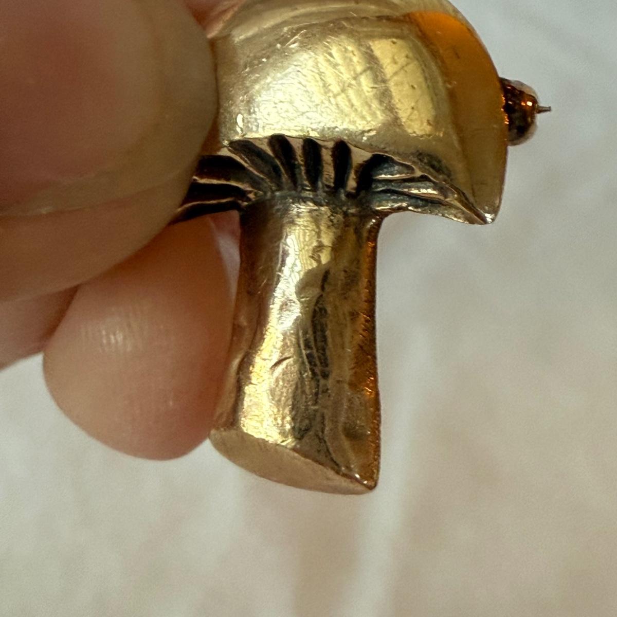 Adorable mushroom pin, just about 1” x 1”. It is stamped 14K. See photos for other markings.