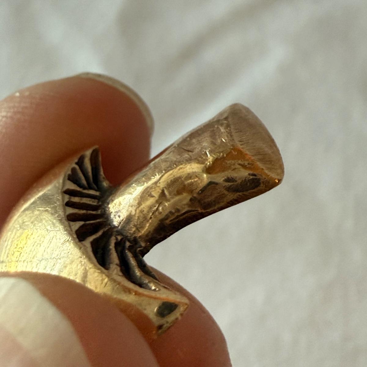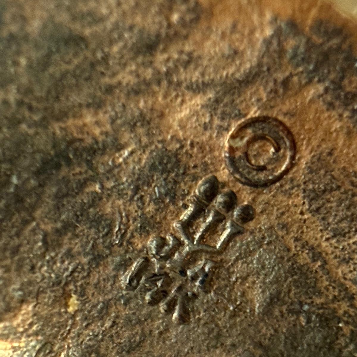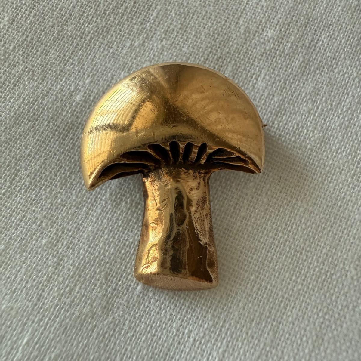 Adorable mushroom pin, just about 1” x 1”. It is stamped 14K. See photos for other markings.
