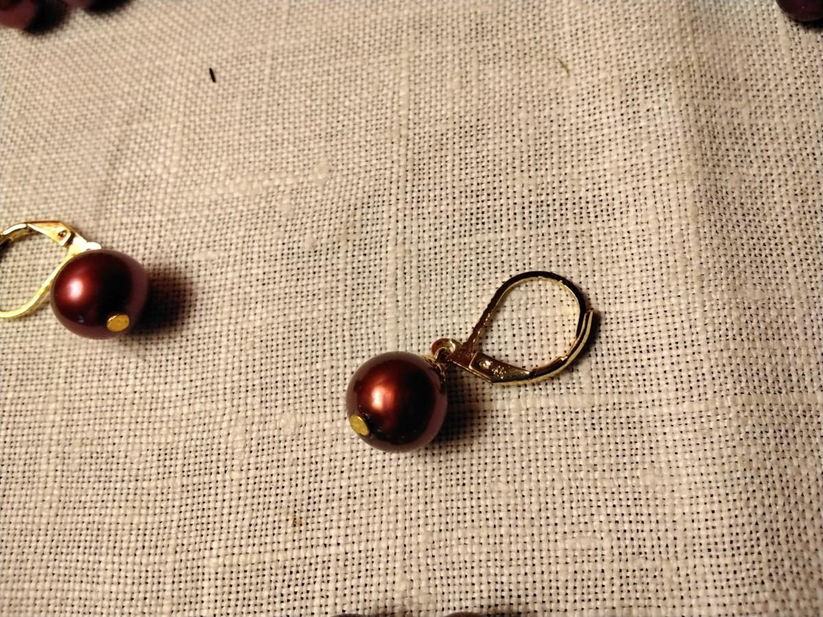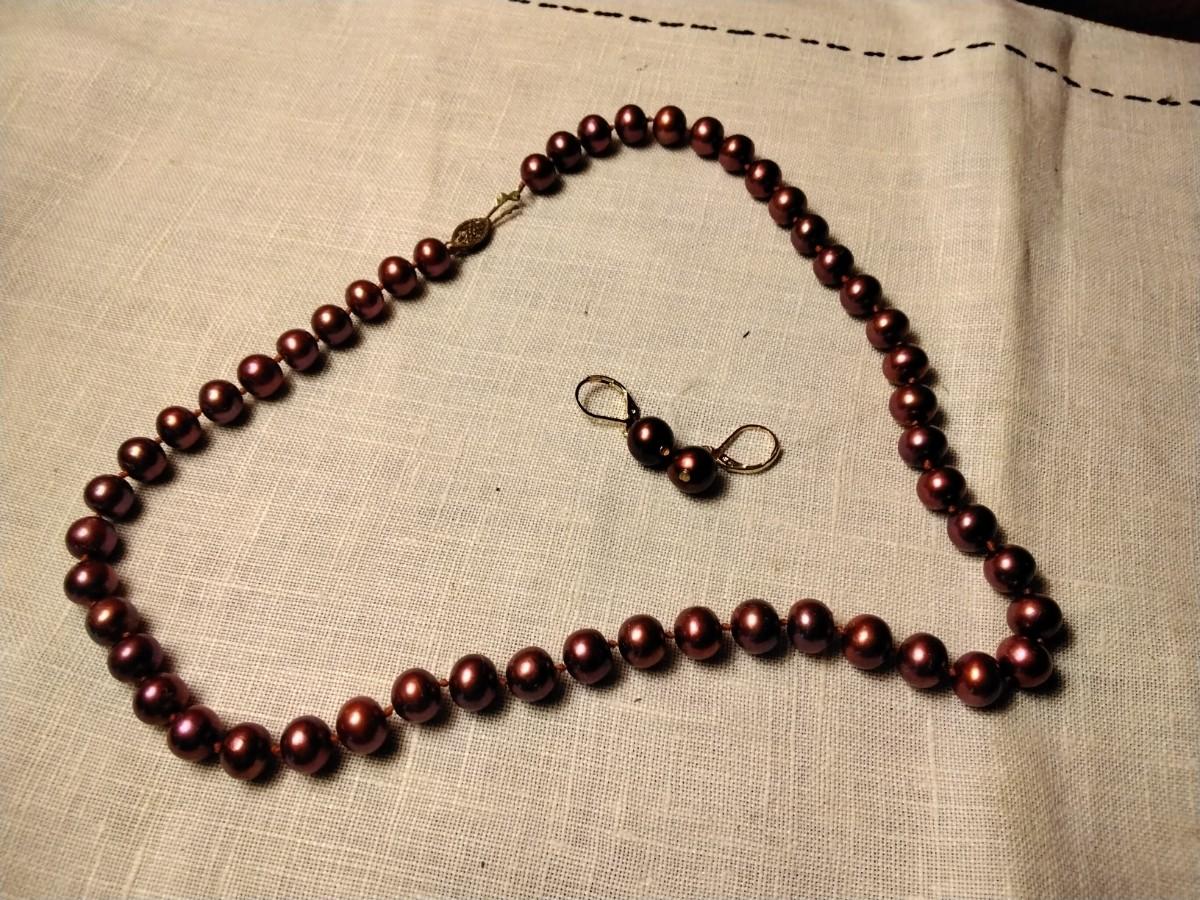 19" Cranberry Pearl Necklace and Pearl Earrings Both 14 Gold Clasps