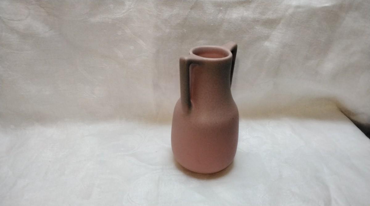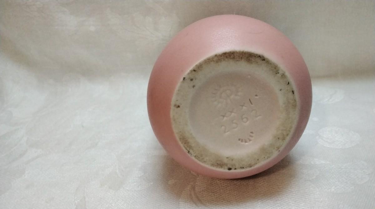 This is an excellent two handled Rookwood vase in a mauve color towards the bottom and fading to a tan shade towards the top. The inside of the vase is mauve. It doesn't appear to have been used. The vase has a smooth matte finish and I see no scratches. There are no chips, cracks repairs or crazing. It looks like it just came from the factory. The bottom of the vase has the Rookwood logo, the designation XXX for a production date of 1930 and the number 2562 for the shape design. Size is 5.25" high. 2" base