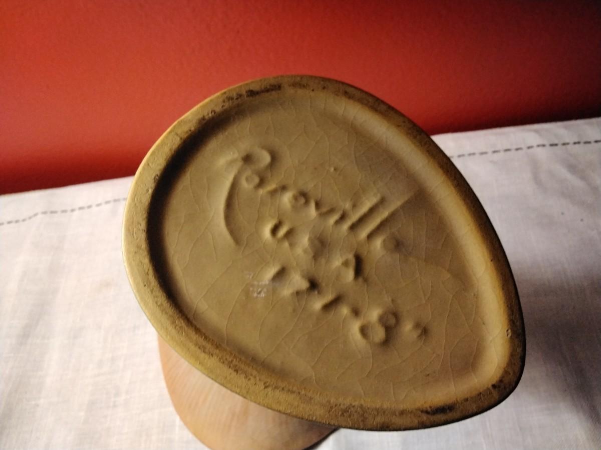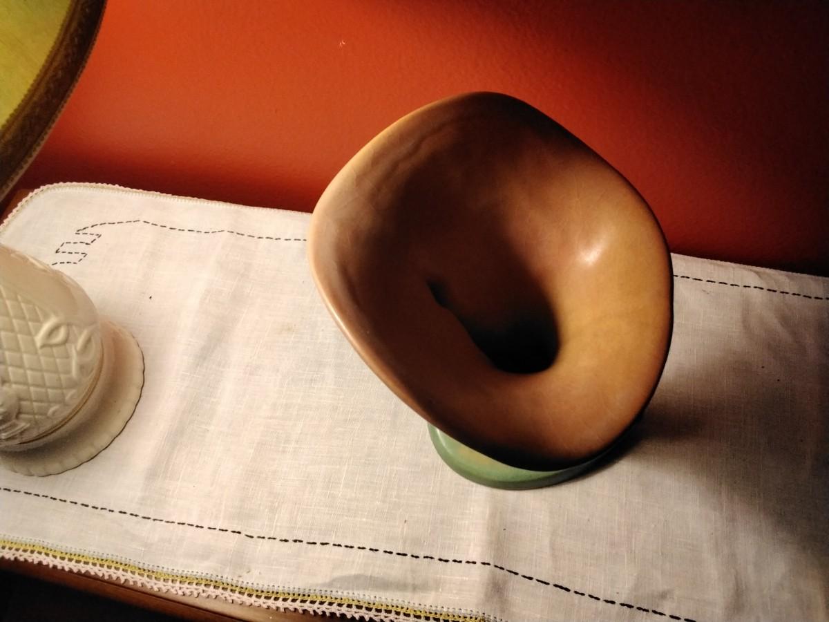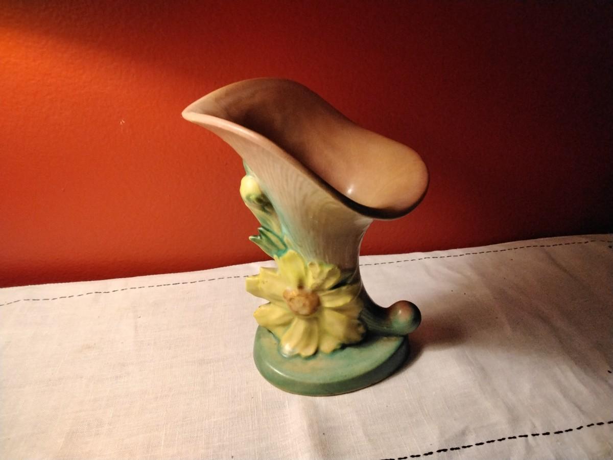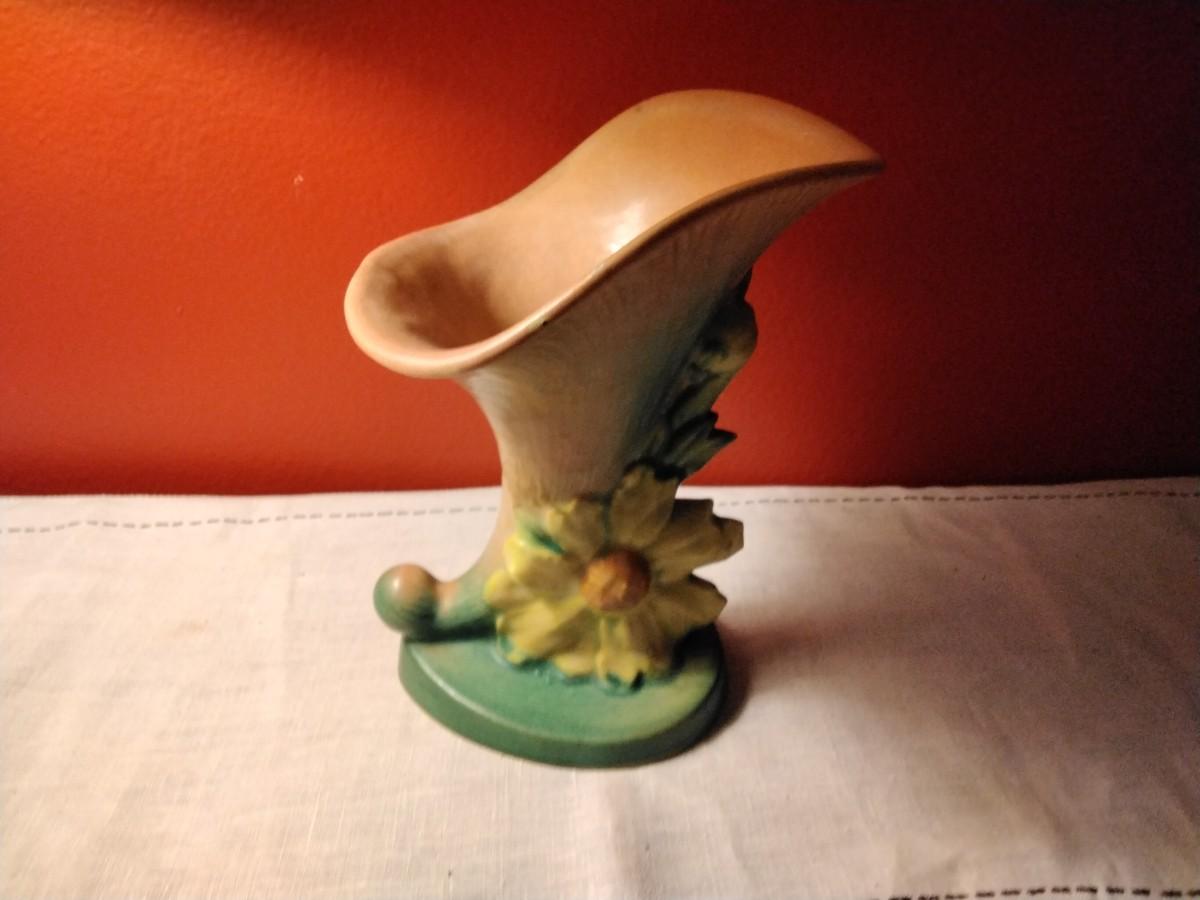 Larger cornucopia shaped vase with a broad rim and curved tail. The peony pattern features showy rounded blooms and partially opened buds on a wood textured background. Glazed in coral pink, blending into an aqua green with bright yellow blossoms and narrow green leaves. Late Line, introduced in 1942.