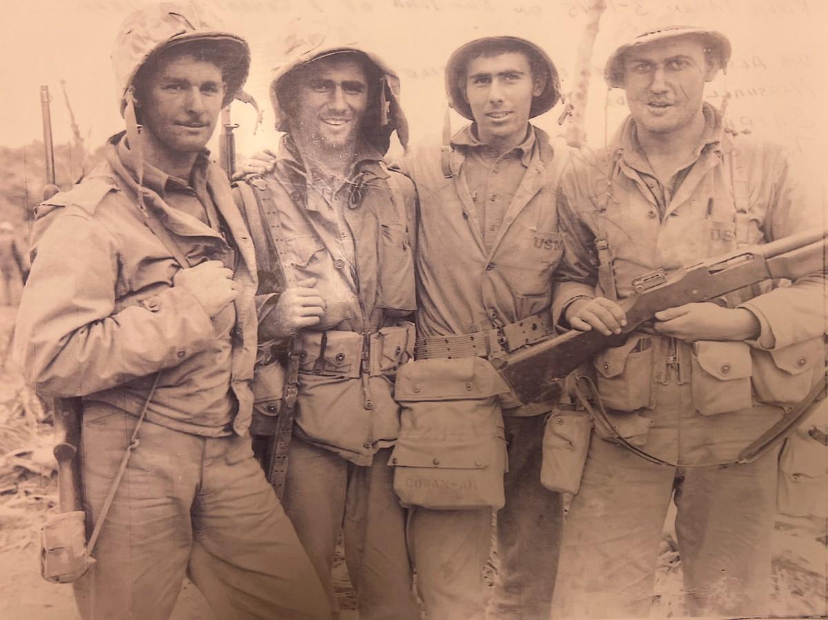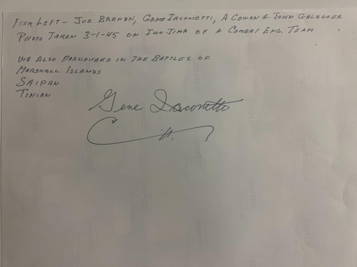 WWII Iwo Jima combat engineer team signed photo autographed by Joe Brenen, Gene Iaconetti, A. Cowan and John Gallagher. 3-1-45. 9x12 inches