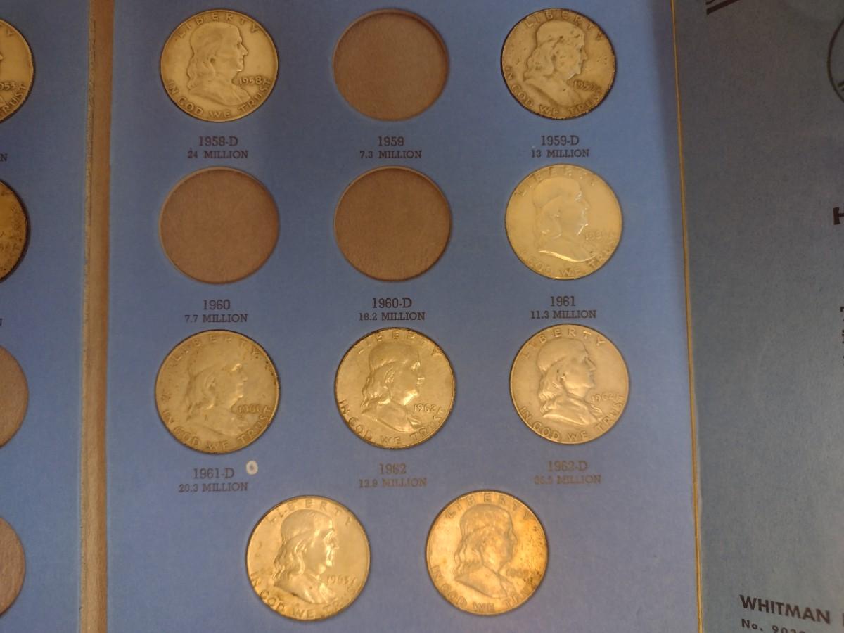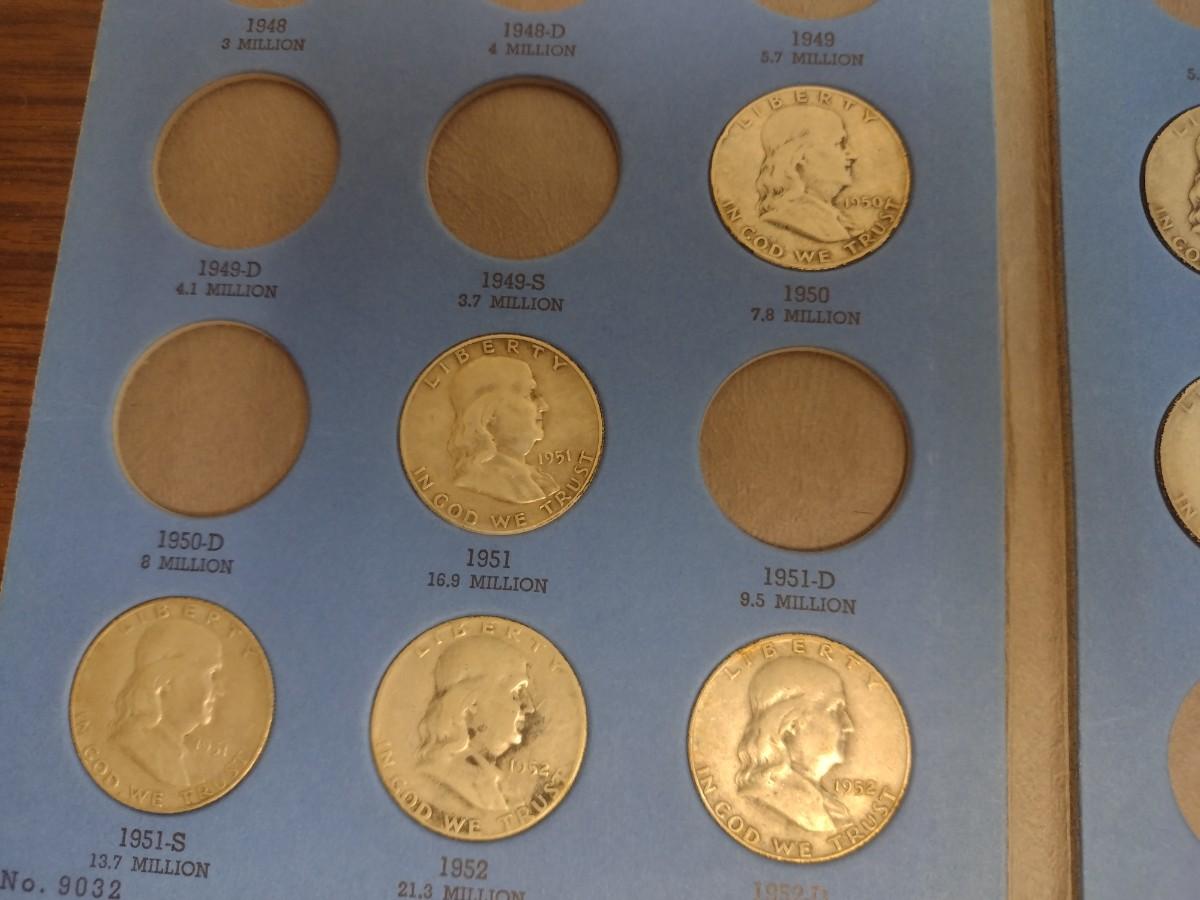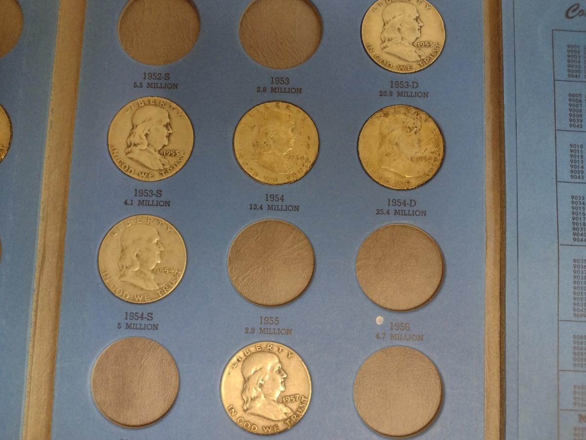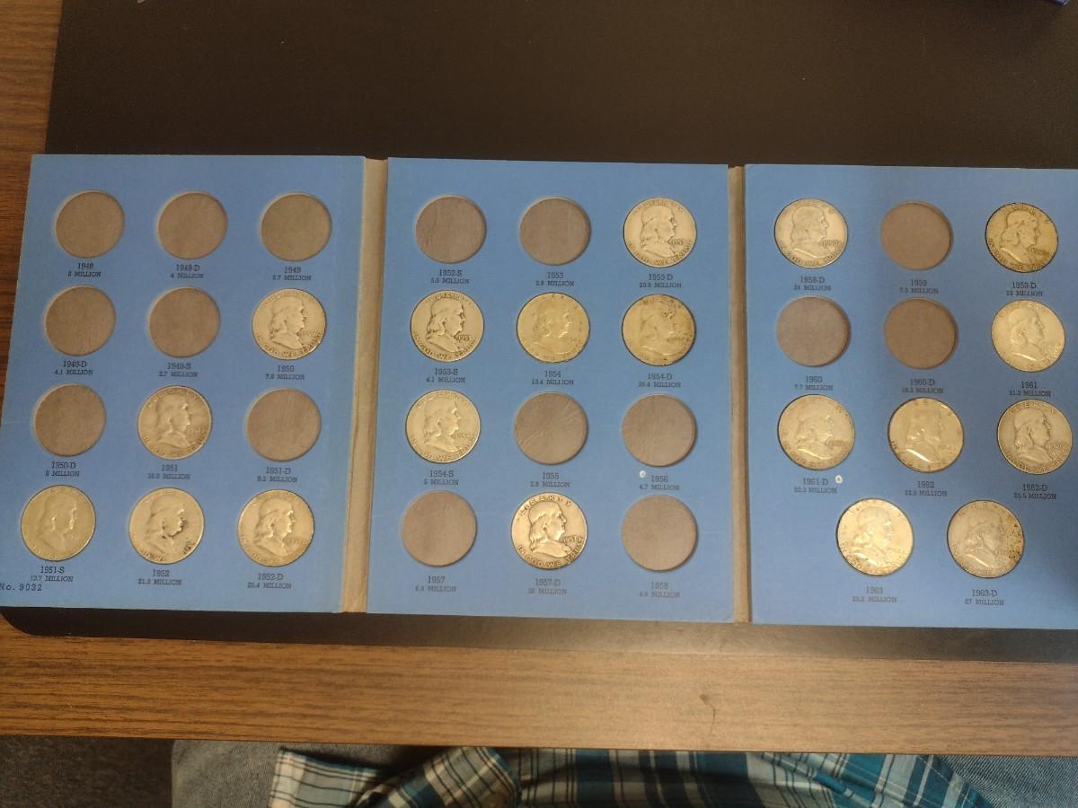1948-1963 Benjamin Franklin Half Dollar Silver Coin Collection as Shown (#64). Incomplete set as shown