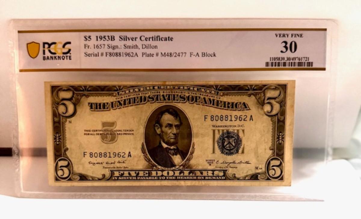 1953B $5 Bill Silver Cert. Graded VF 30