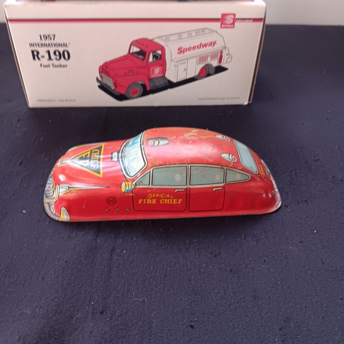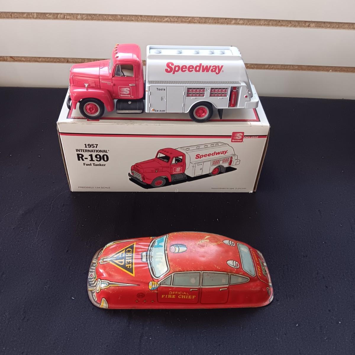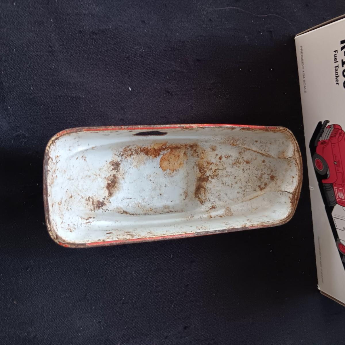 1957 INTERNATIONAL R-190 DIE-CAST FUEL TANKER AND THE TIN BODY OF A TOY CAR