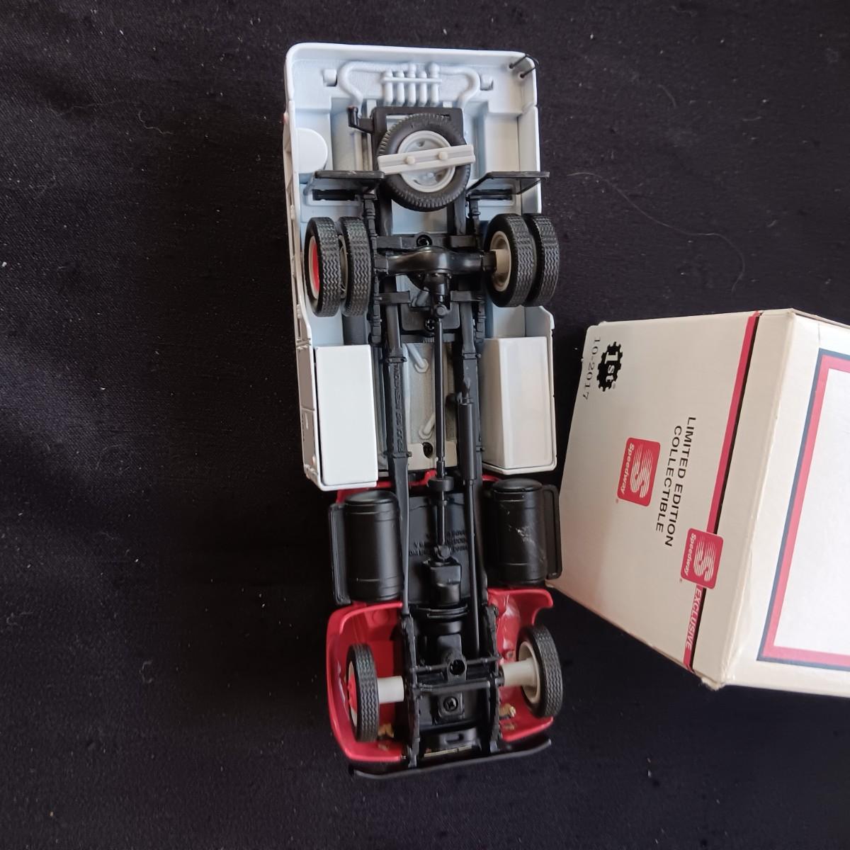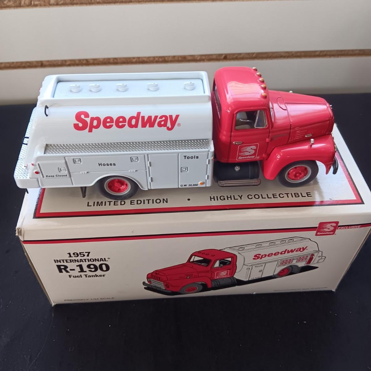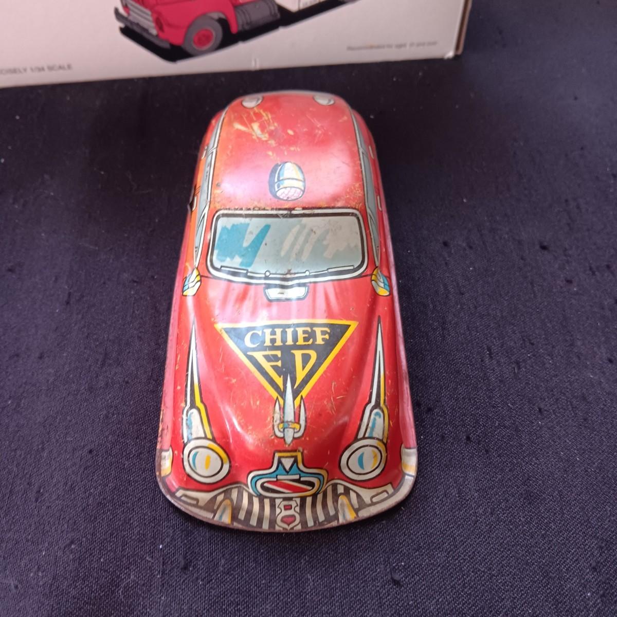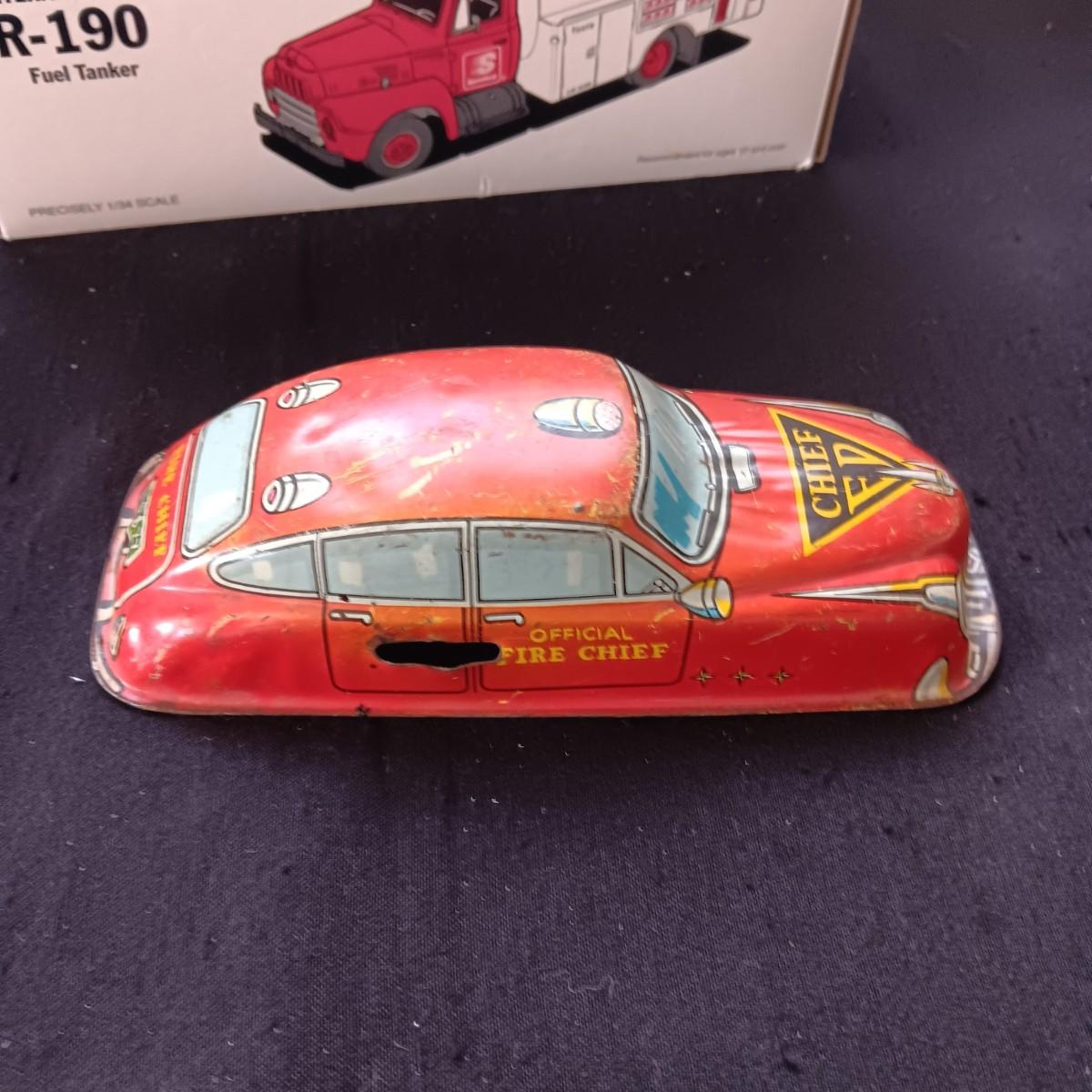 1957 INTERNATIONAL R-190 DIE-CAST FUEL TANKER AND THE TIN BODY OF A TOY CAR
