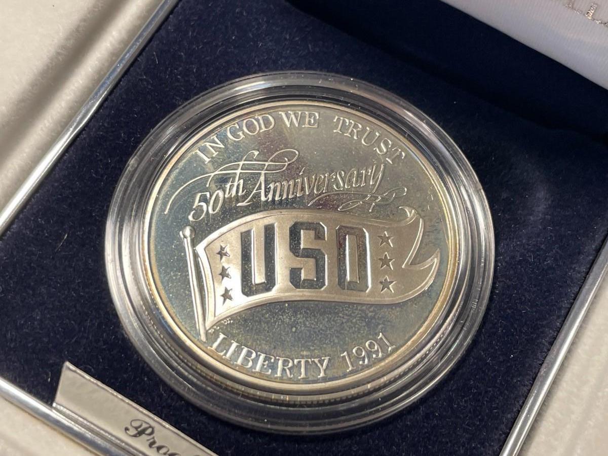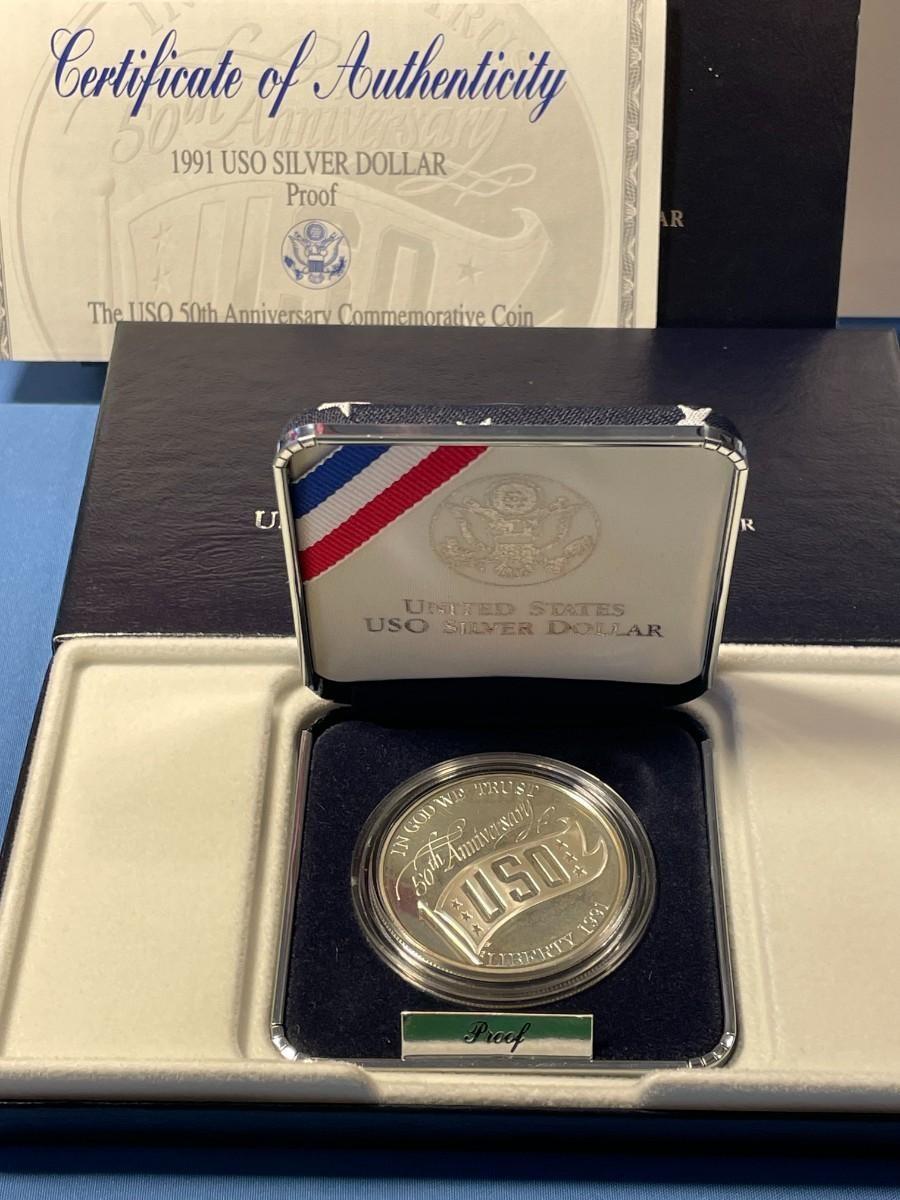 1991-S USO Commemorative Proof Silver Dollar Mint Box and COA as Pictured.