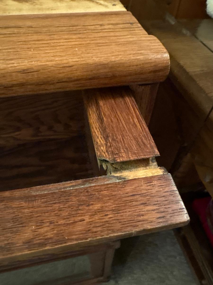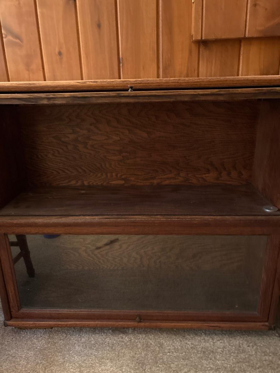Needs repair. The top door has the glass, but it’s not installed. Please see pics for condition of the item.. 34x12x31