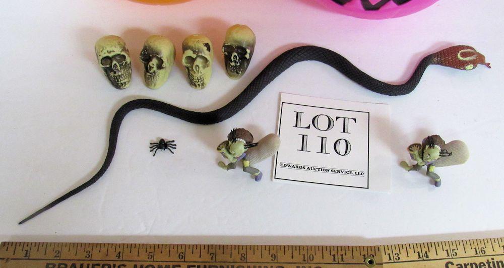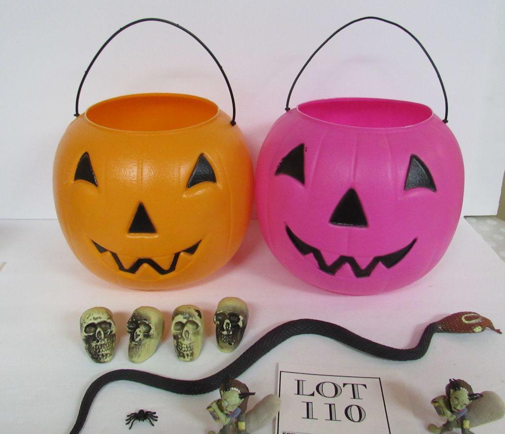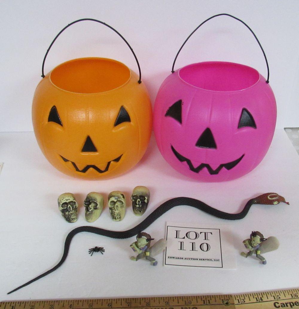 2 Halloween Blow Mold Buckets, 4 Hard Plastic Skulls, Rubber Snake, More