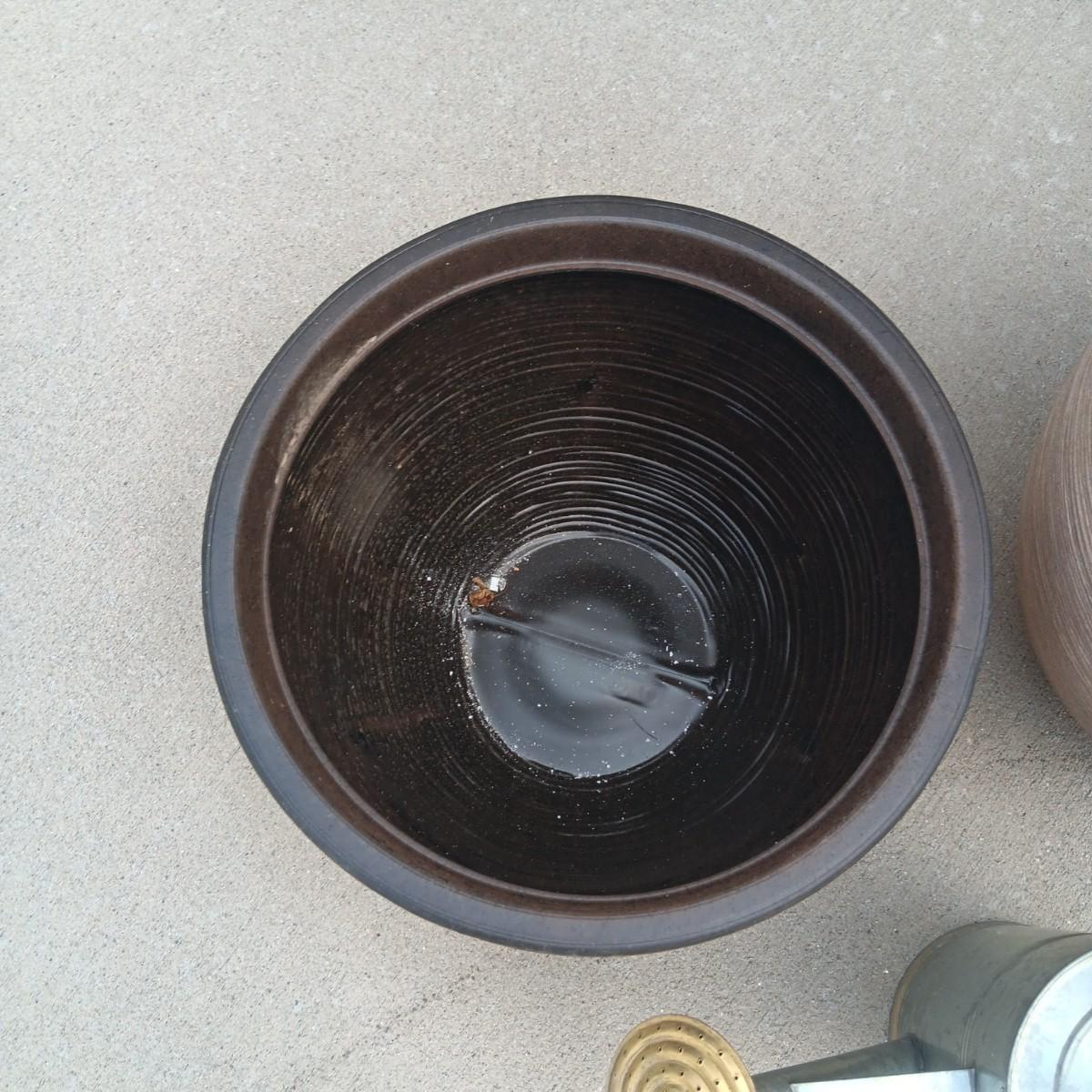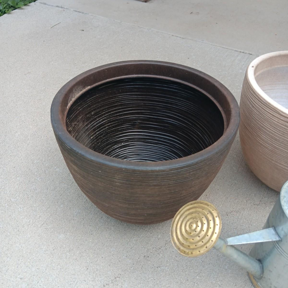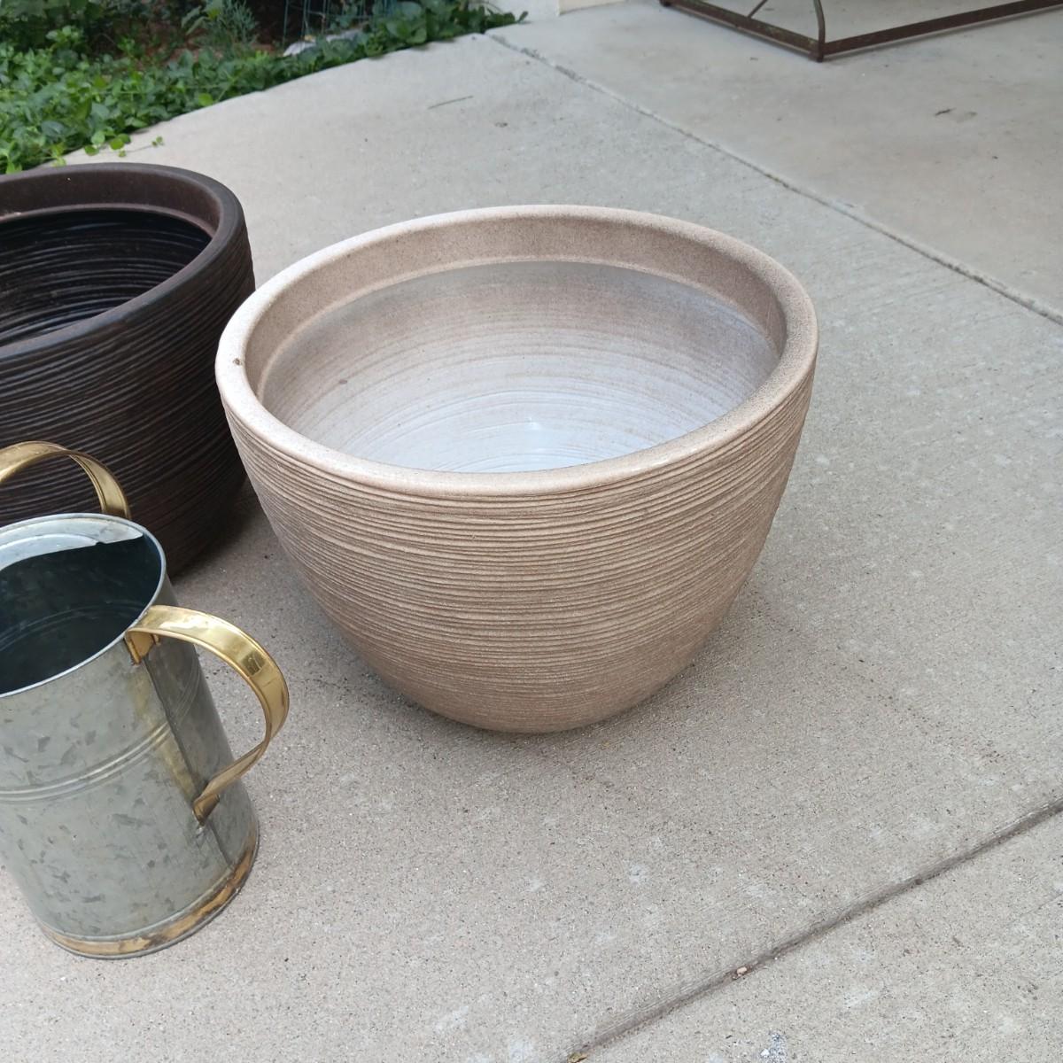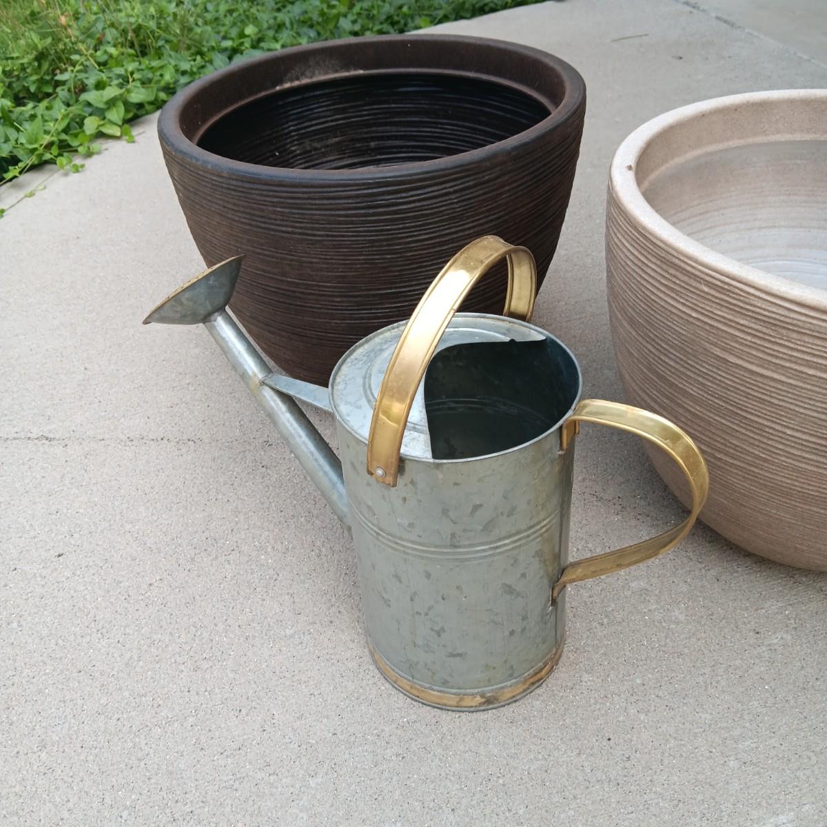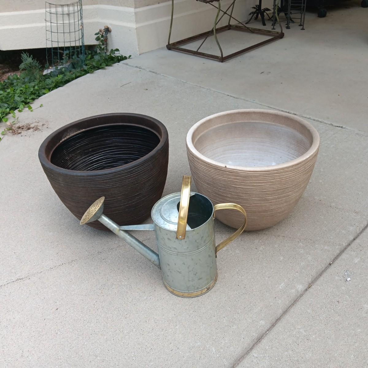2 LARGER PLASTIC FLOWER POTS AND A WATERING CAN