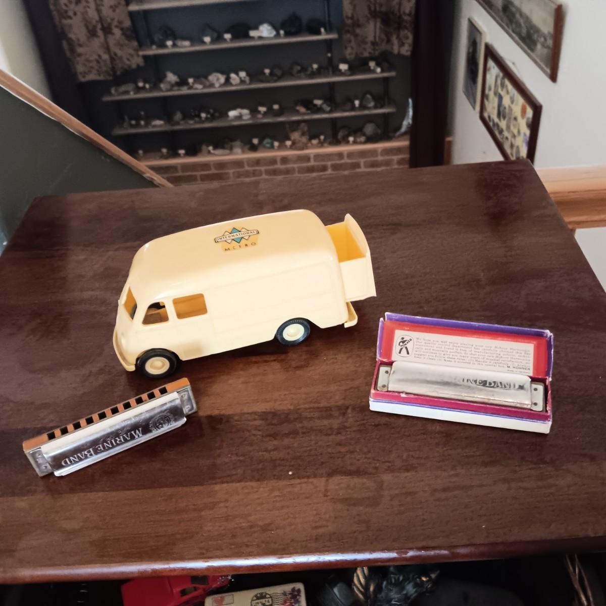 2 MARINE BAND HARMONICAS AND A PLASTIC METRO VAN