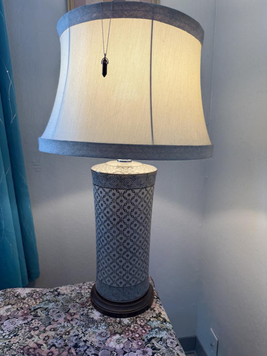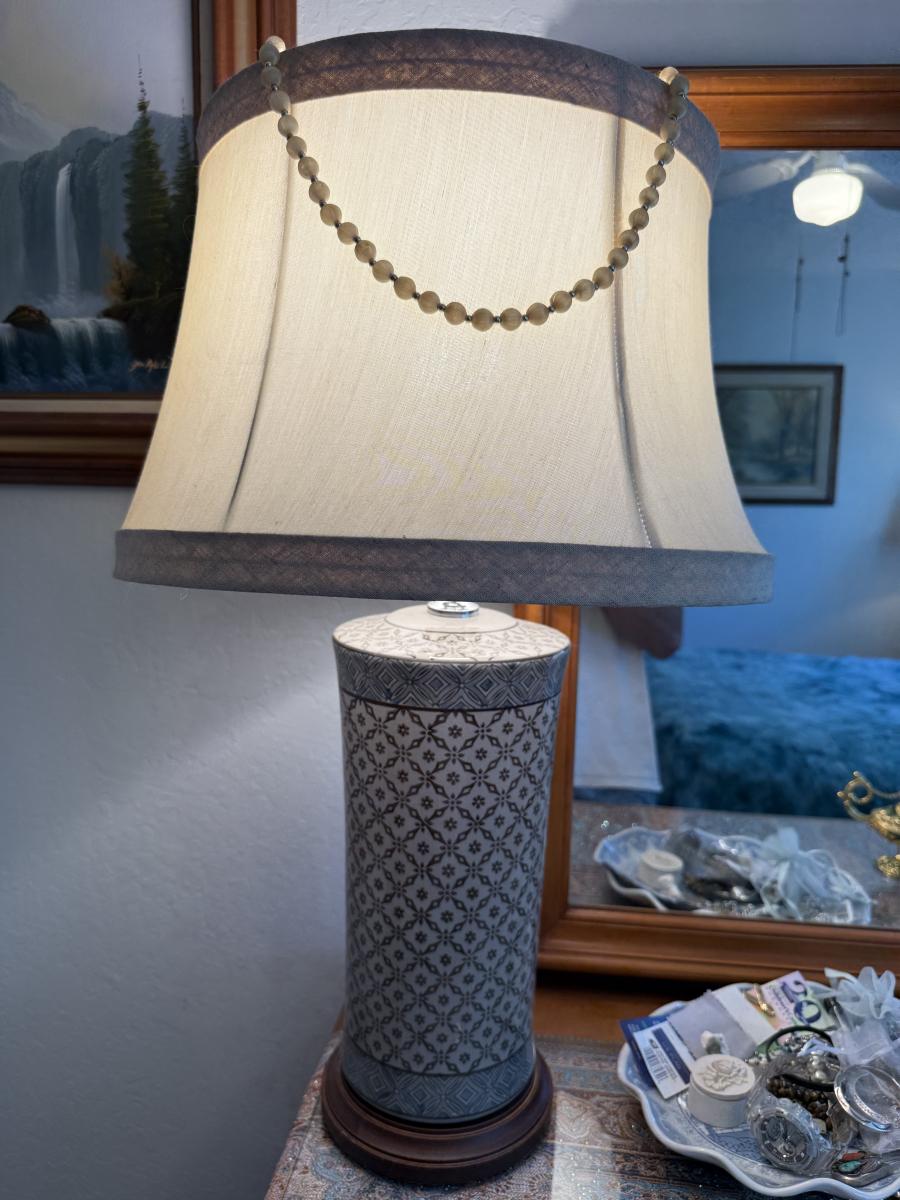 Tall ceramic lamp with geometric patterned base and fabric shade, modern yet classic.