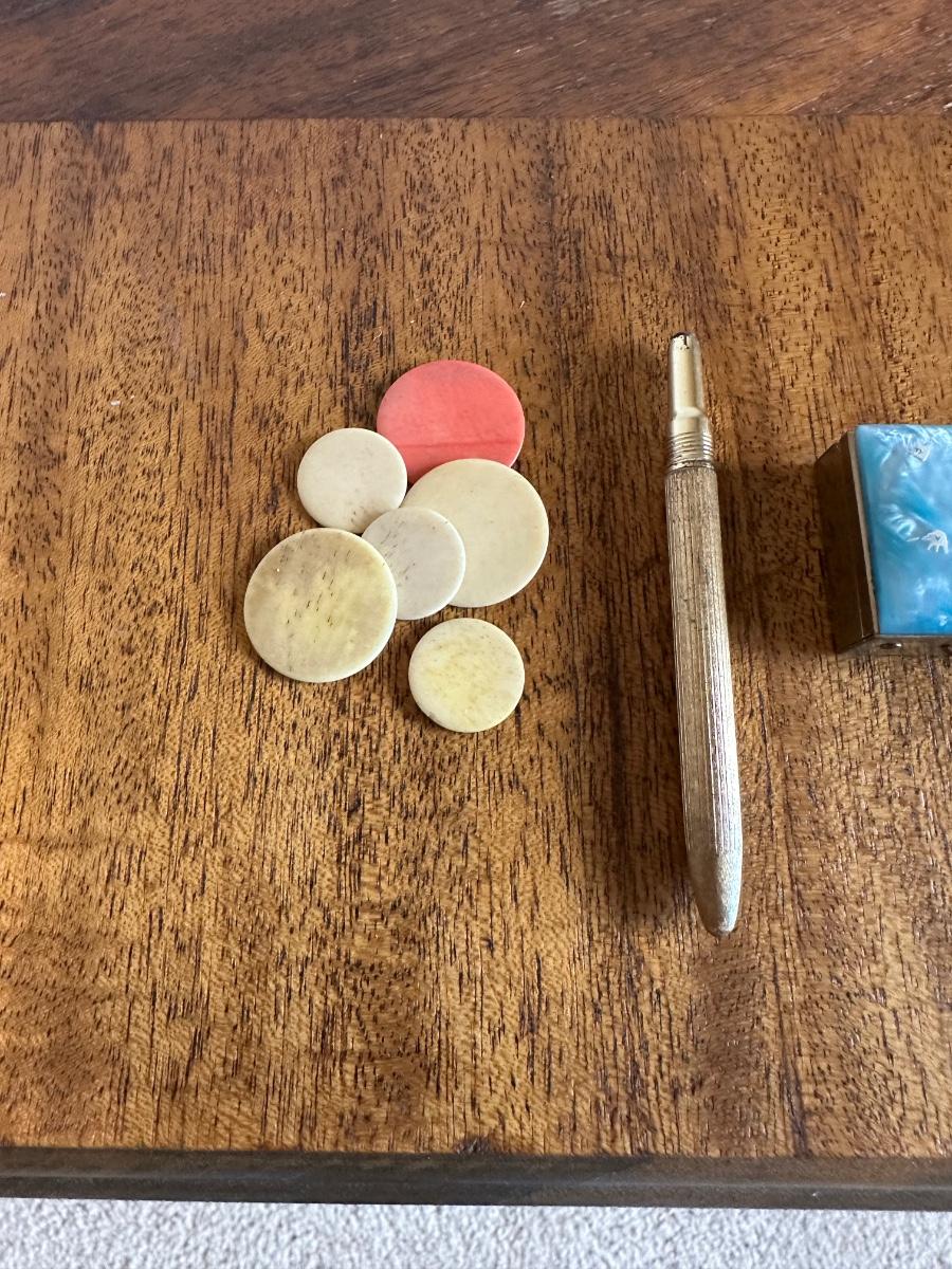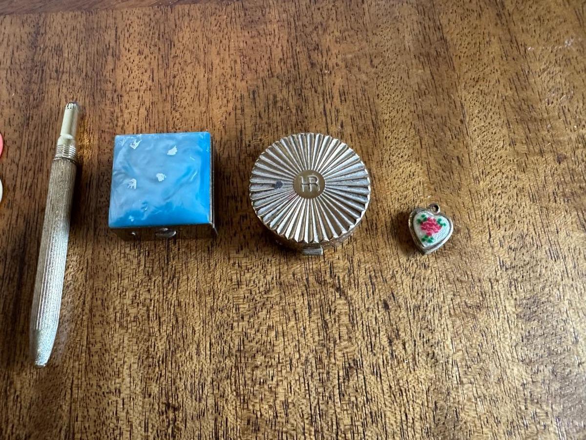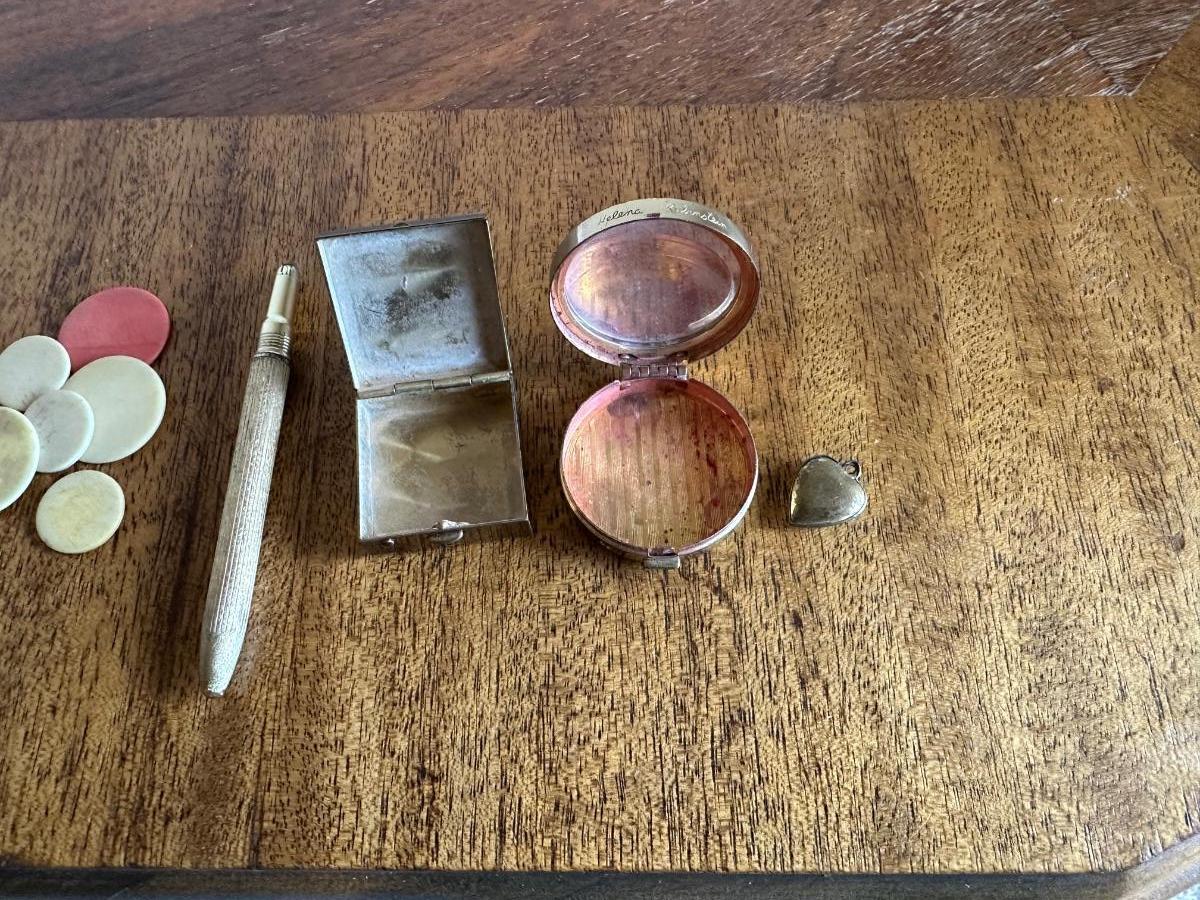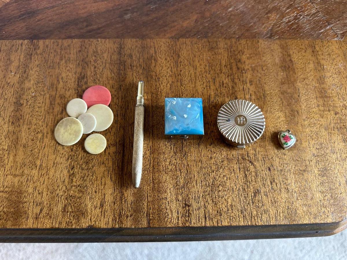2 PILL CASES, CHIPS, HEART LOCKET AND A PEN