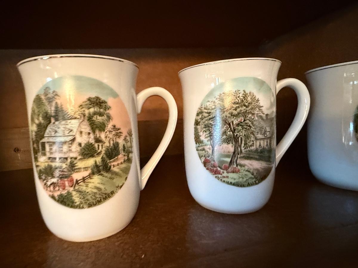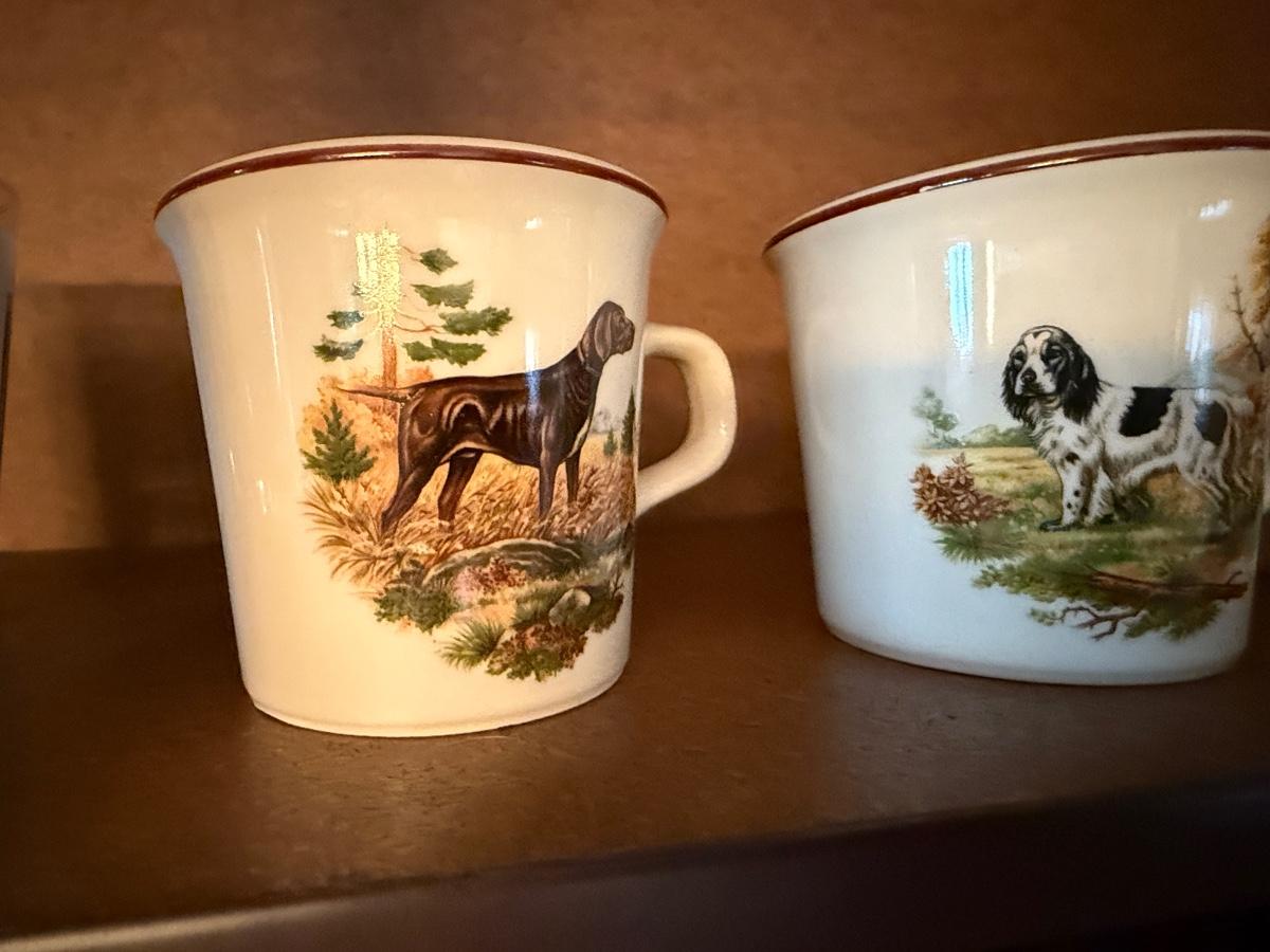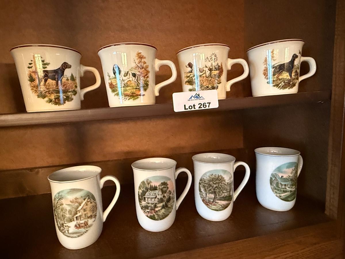 2 sets of 4 country scene/dogs collectible mugs