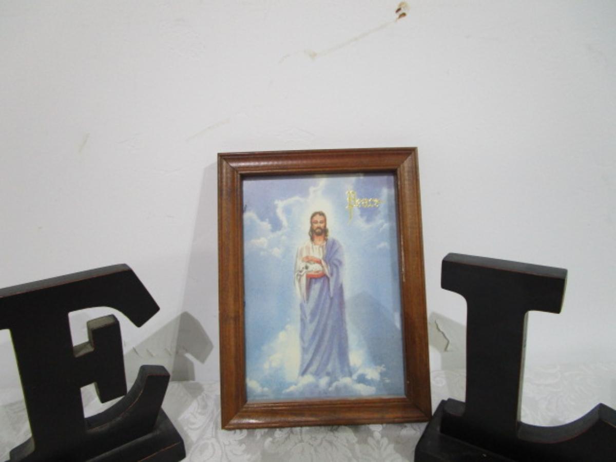 2 Shelf décor, 2 small picture frames, 1 framed picture of Jesus