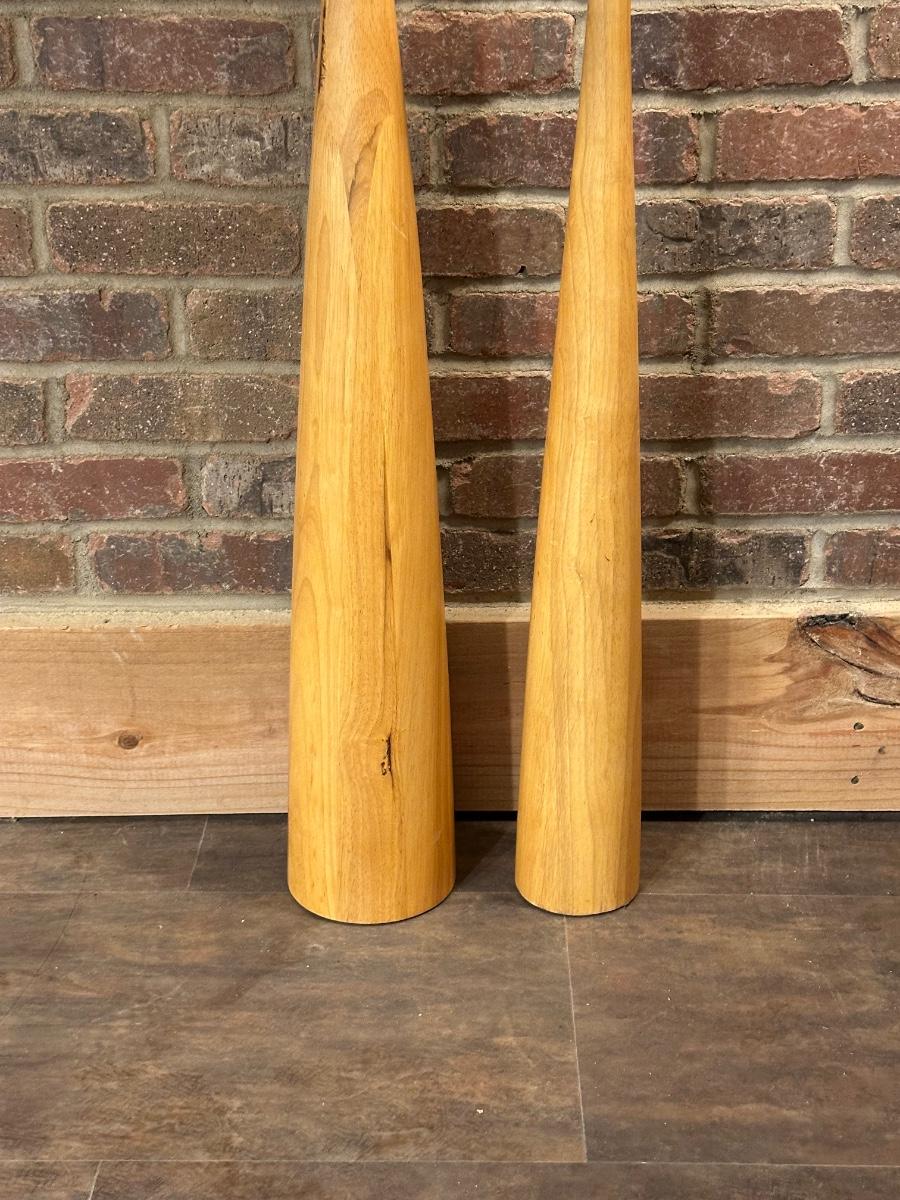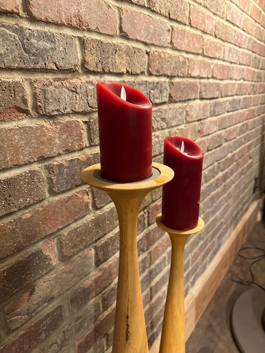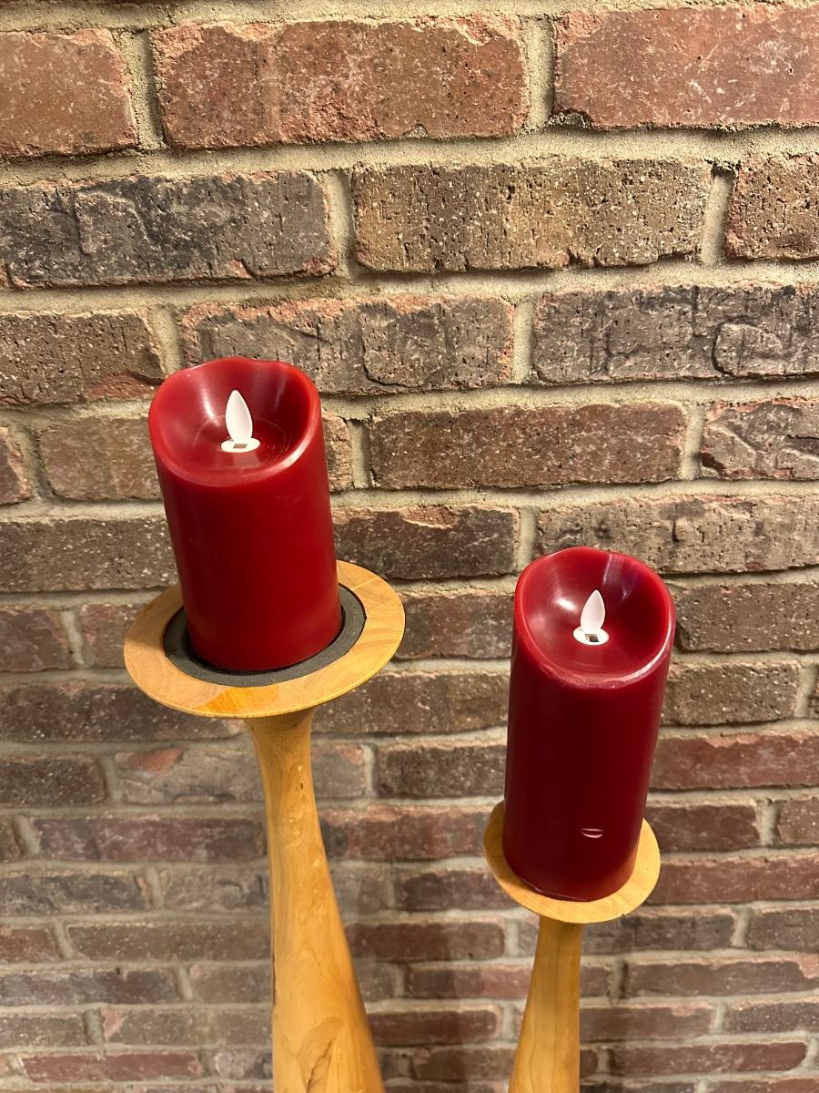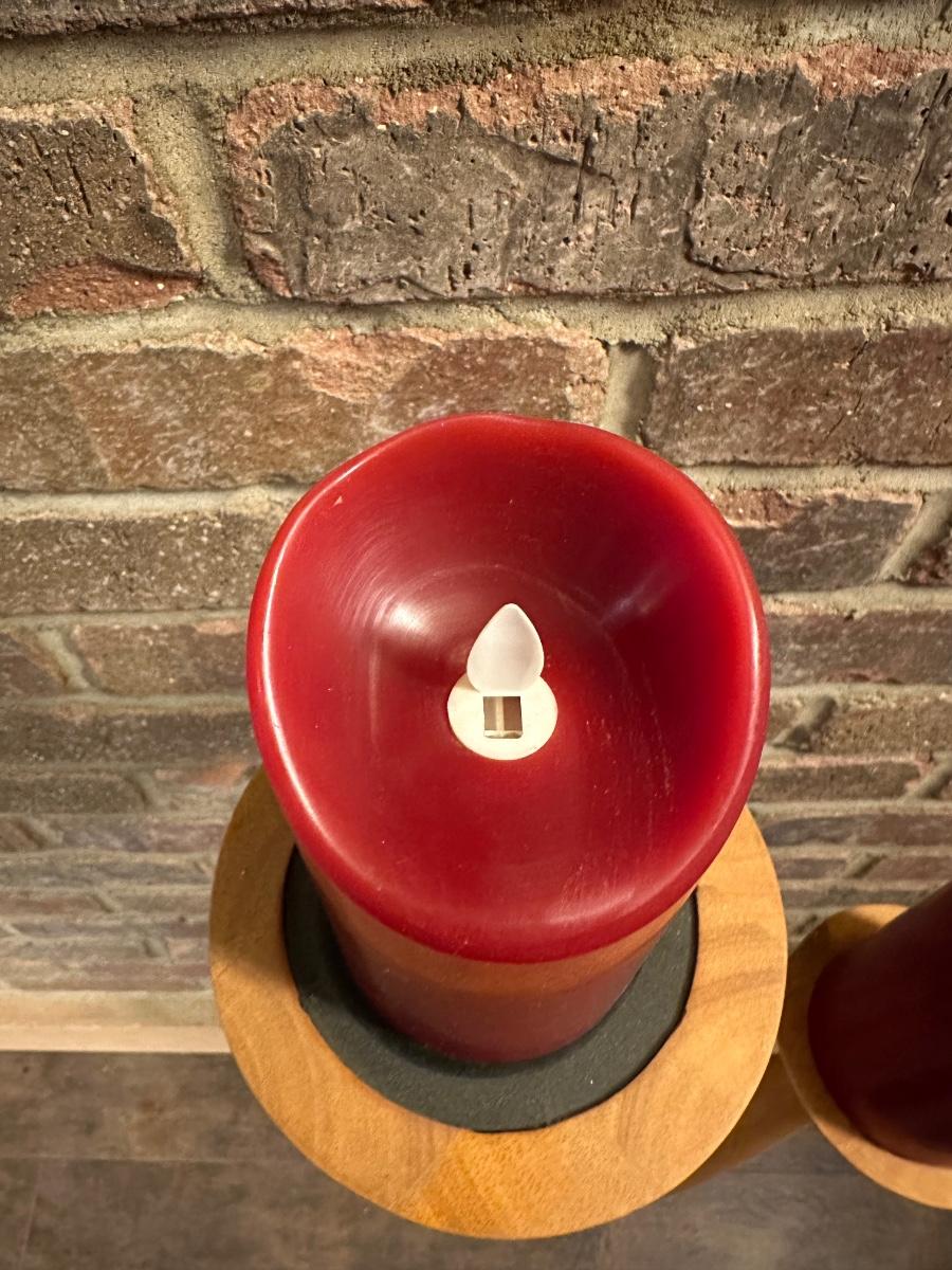 2 TALL WOODEN CANDLE HOLDERS WITH FLAMELESS CANDLES