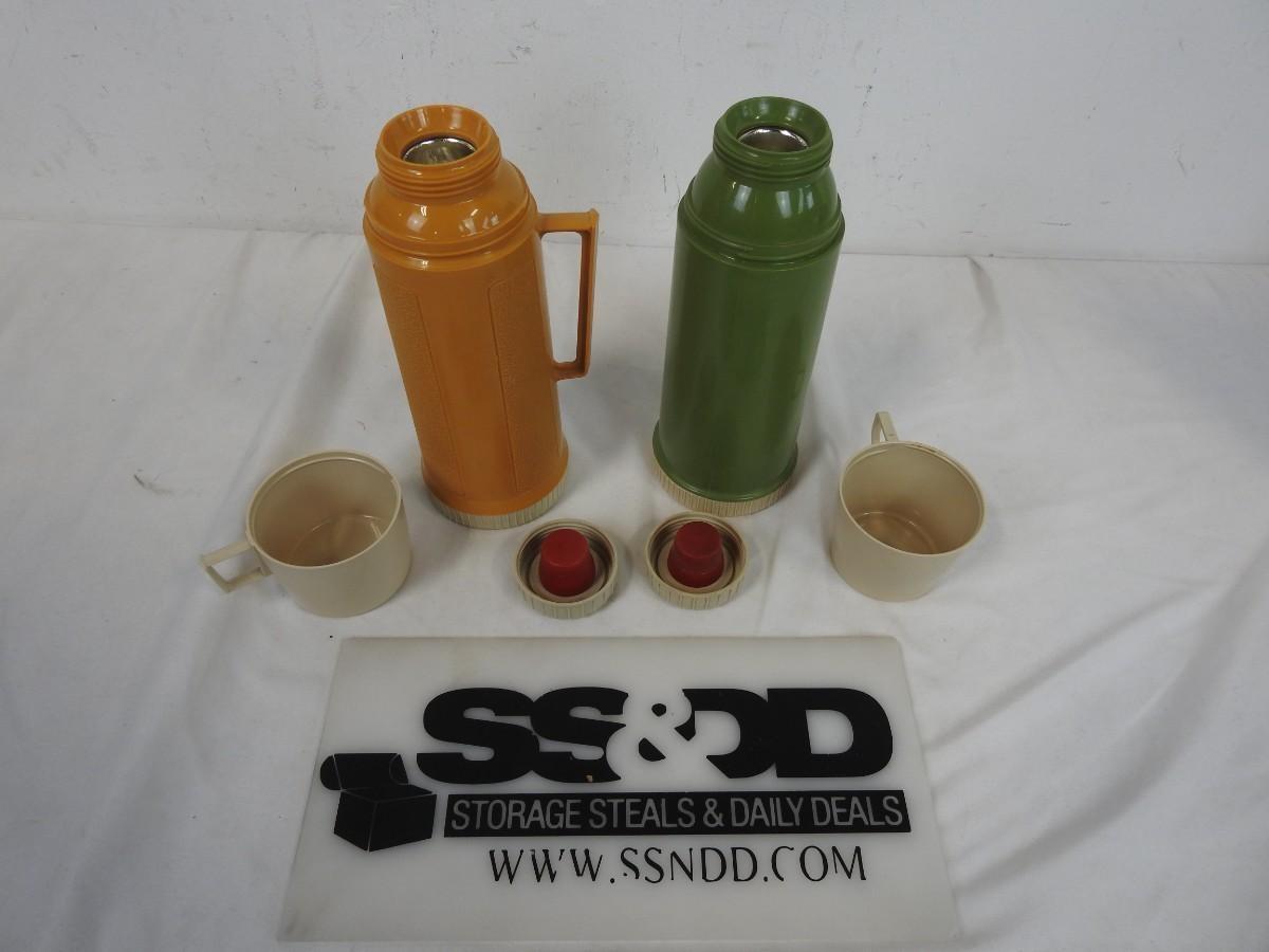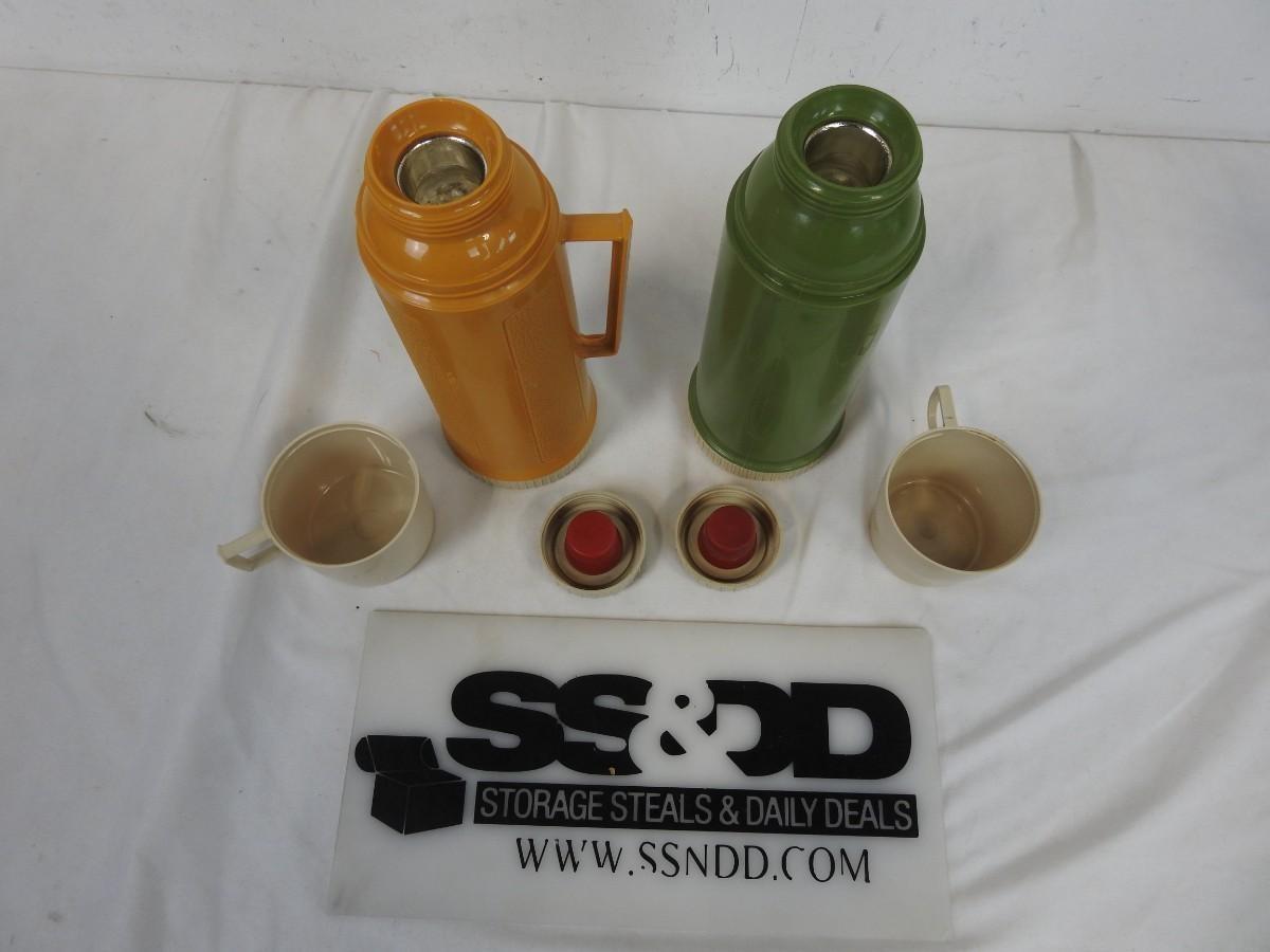 2 Thermos Hot Drink Containers with Stopper Lids & Cups. Green, Yellow, Vintage