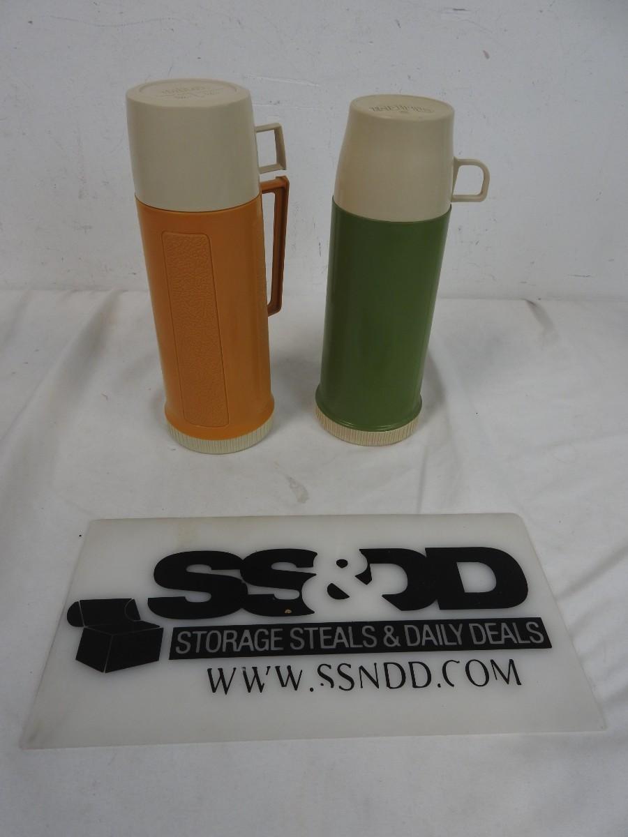 2 Thermos Hot Drink Containers with Stopper Lids & Cup Lids. Green, Yellow, Vintage