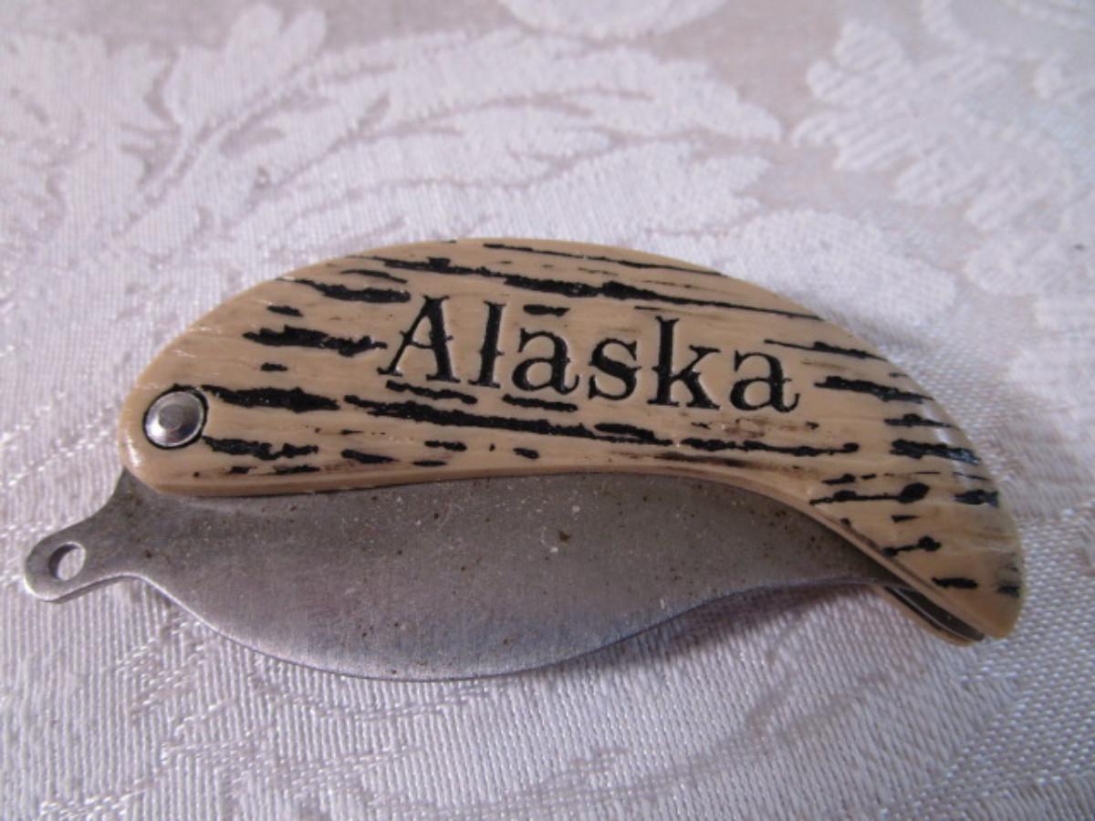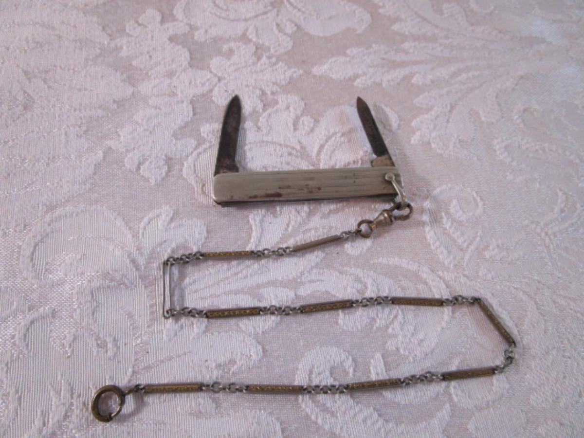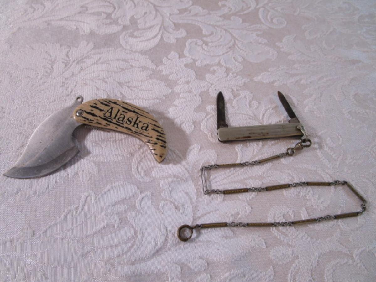 Vintage Old US Clauss folding pocket knife with chain, blade is 1-1/8", file is 1", chain is 12" long; Alaska cultured antler handle pocket ULU knife, blade is 2"