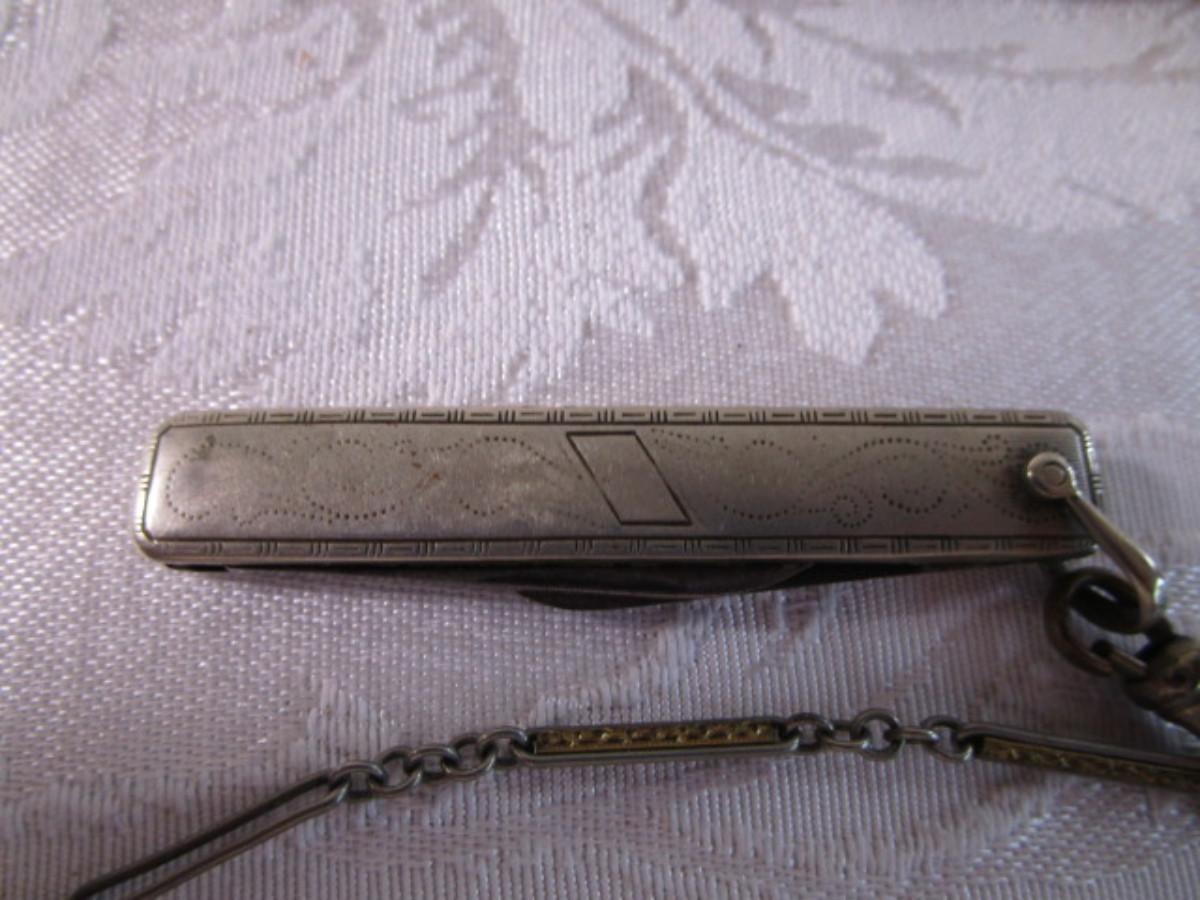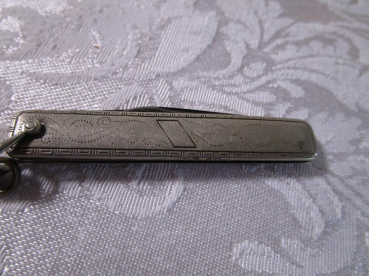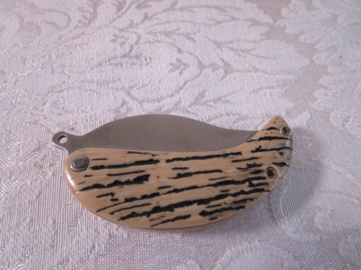 Vintage Old US Clauss folding pocket knife with chain, blade is 1-1/8", file is 1", chain is 12" long; Alaska cultured antler handle pocket ULU knife, blade is 2"