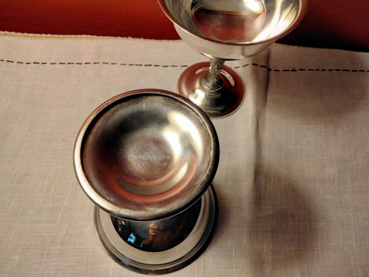 Measurements: 4.25" tall / 3.75" wide / 2.5" base. Produced by Wm Rogers, Each one holds 5oz. Both marked with a logo followed by 'WM Rogers' followed by a star symbol. Items are in pristine condition.