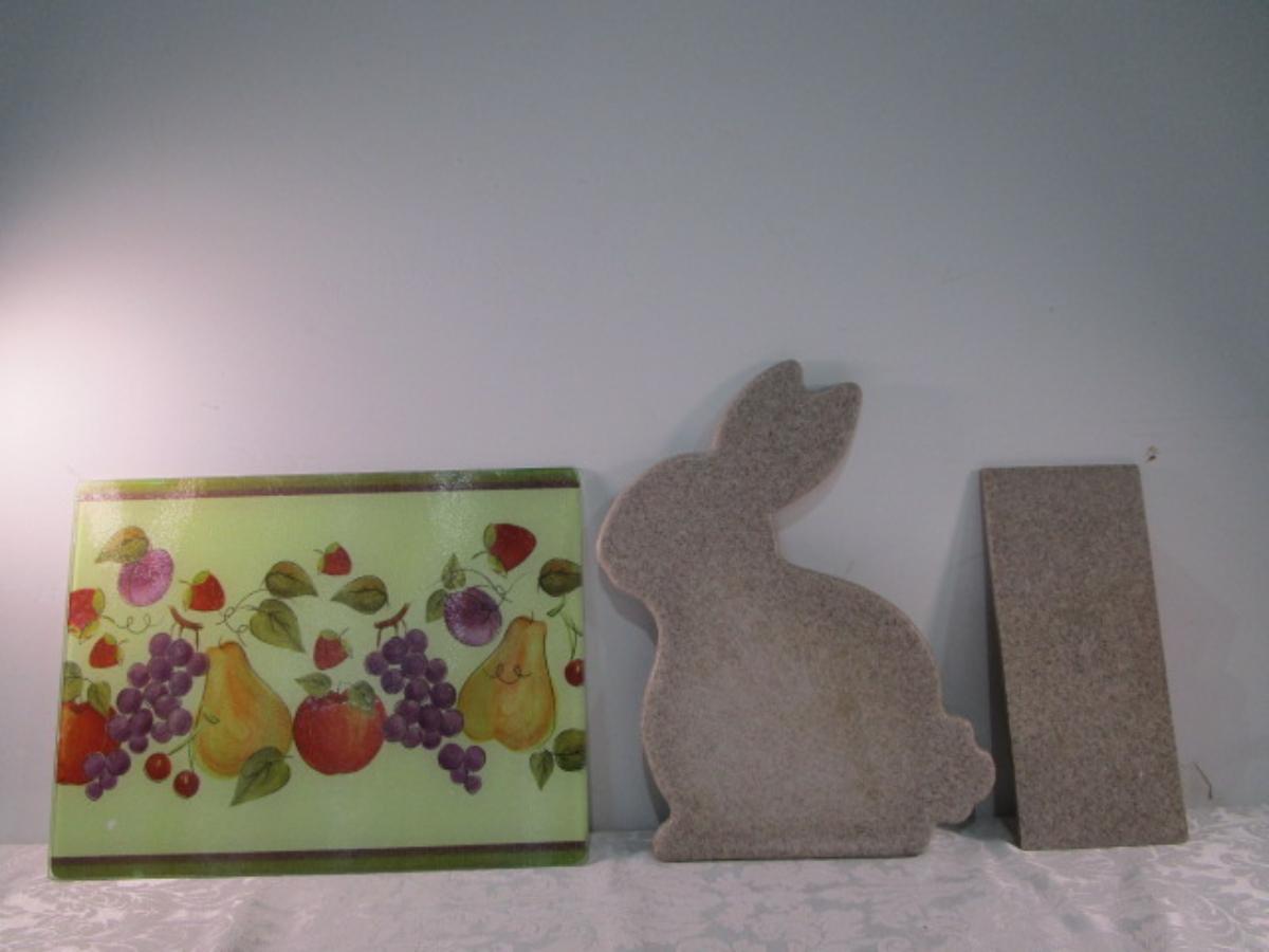 3 cutting boards, 2 of which are stone, 1 is glass