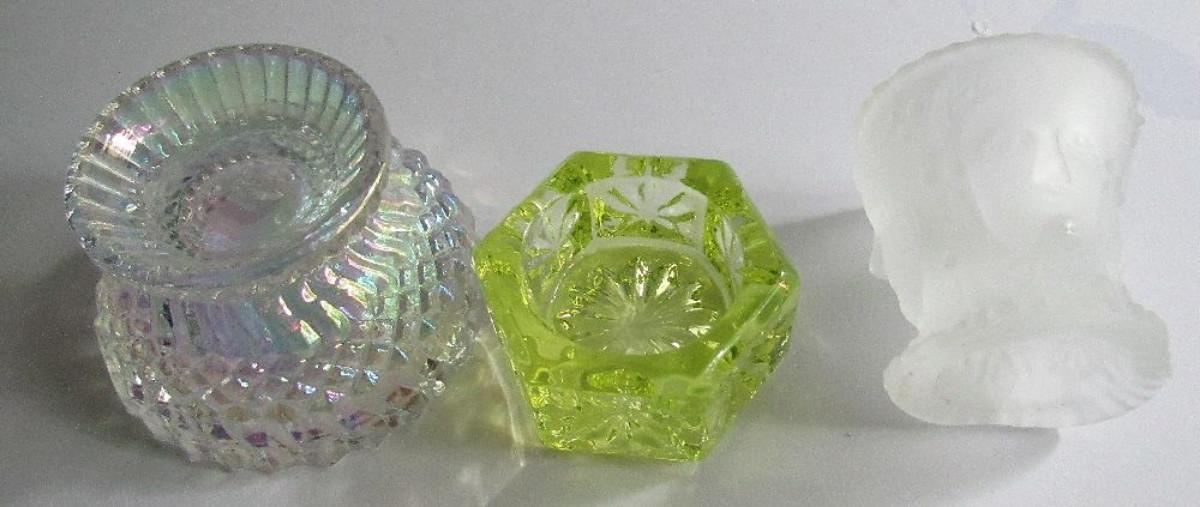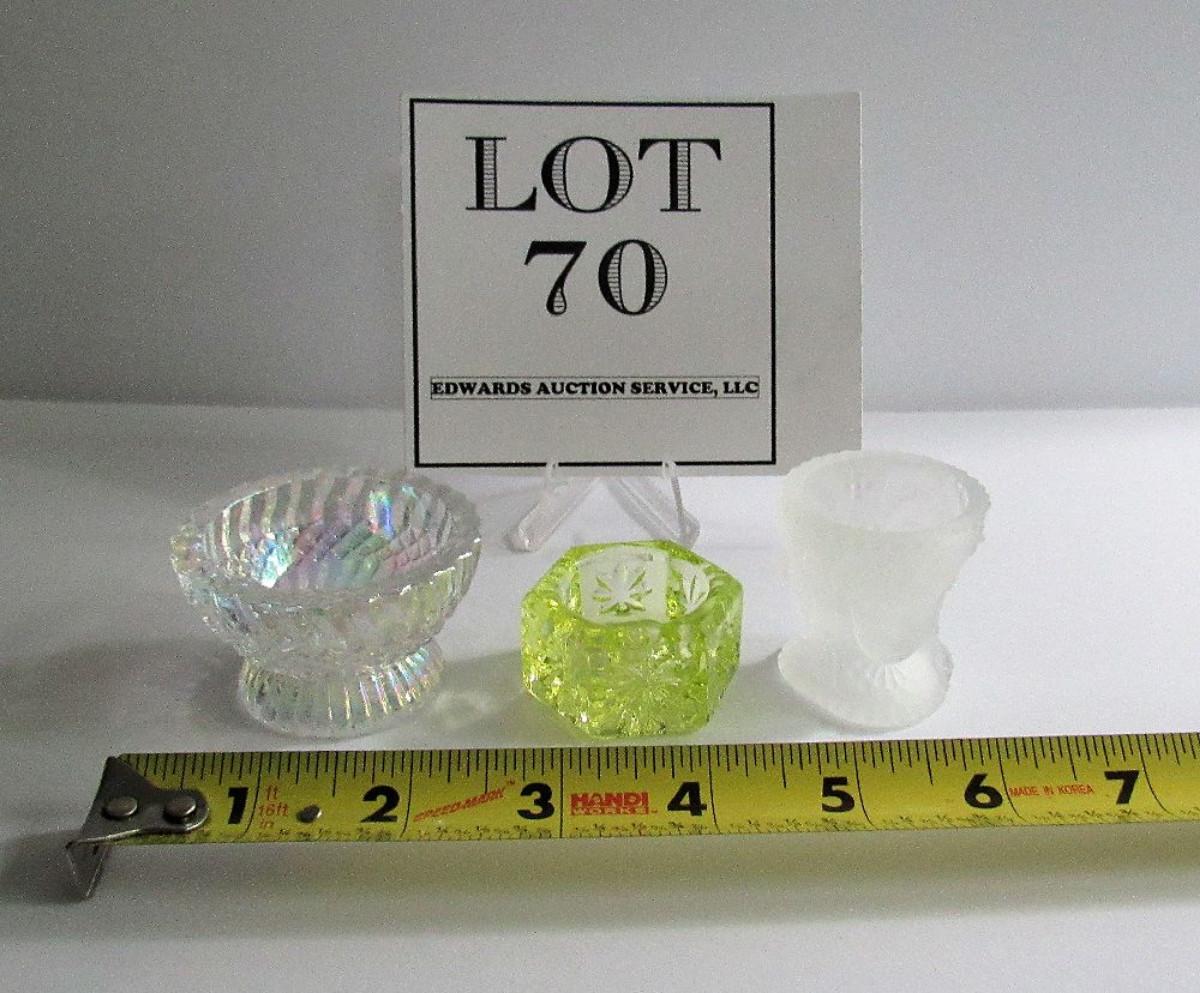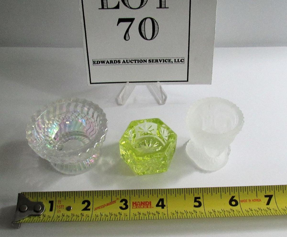 3 Older Glass Open Salt Dips, Vaseline, Clear Carnival, Satin Glass