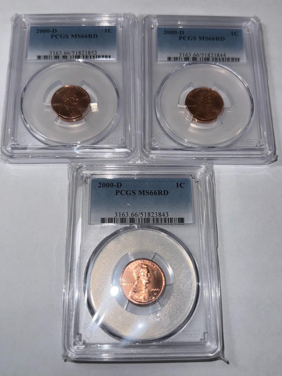 (3) PCGS CERTIFIED 2000-D MS66 RED CHOICE CONDITION LINCOLN CENT LOT AS PICTURED.