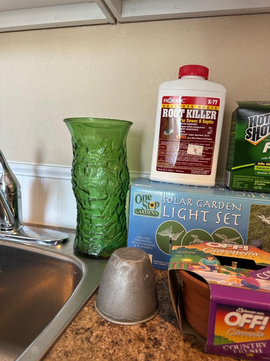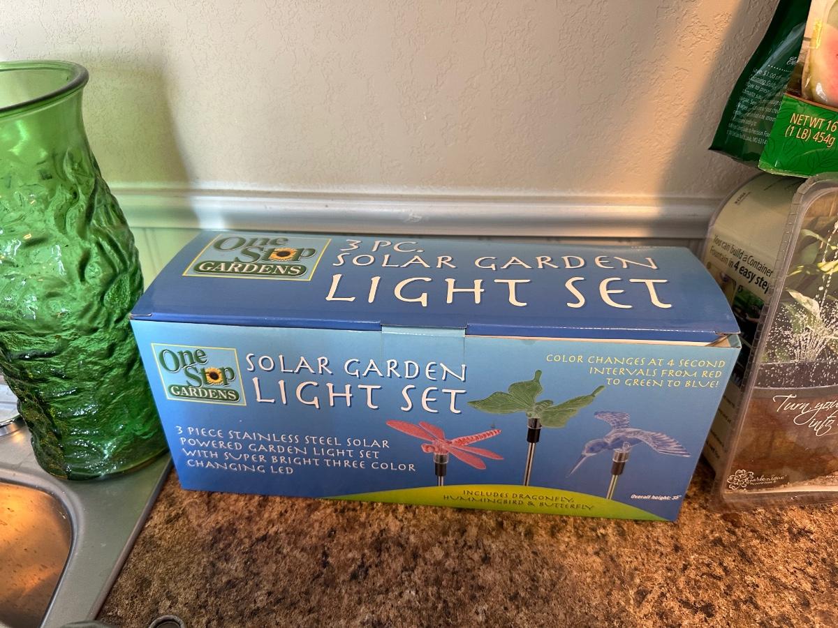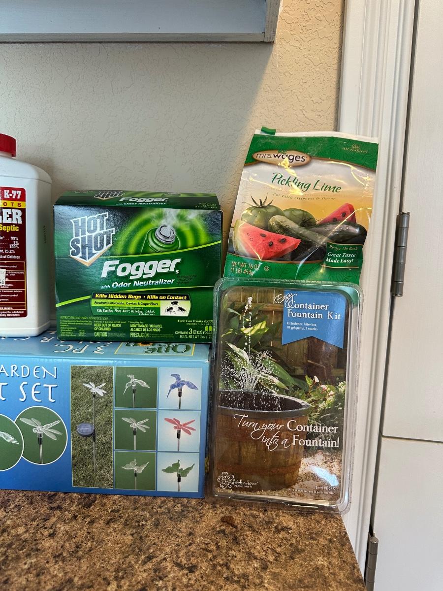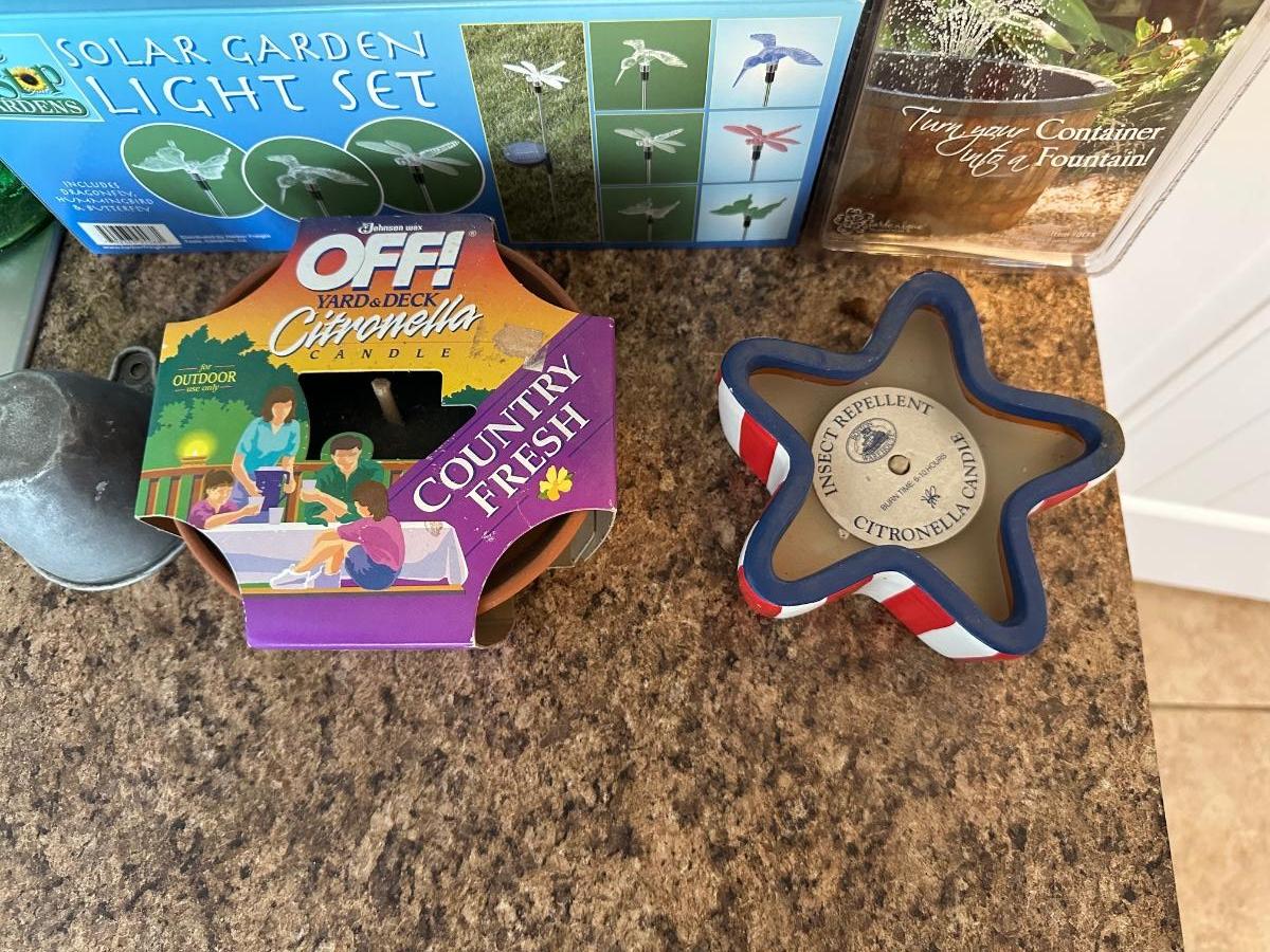 3 PIECE SOLAR GARDEN LIGHT SET, INSECT REPELLENT CANDLES, HOT SHOT INSECT FOGGER, CONTAINER FOUNTAIN KIT AND MORE
