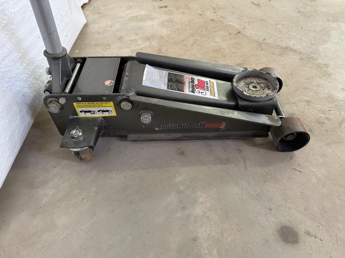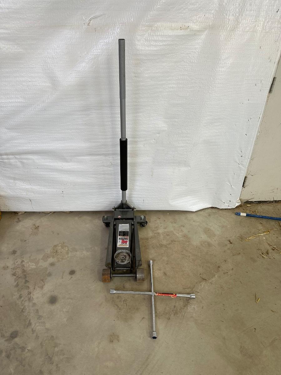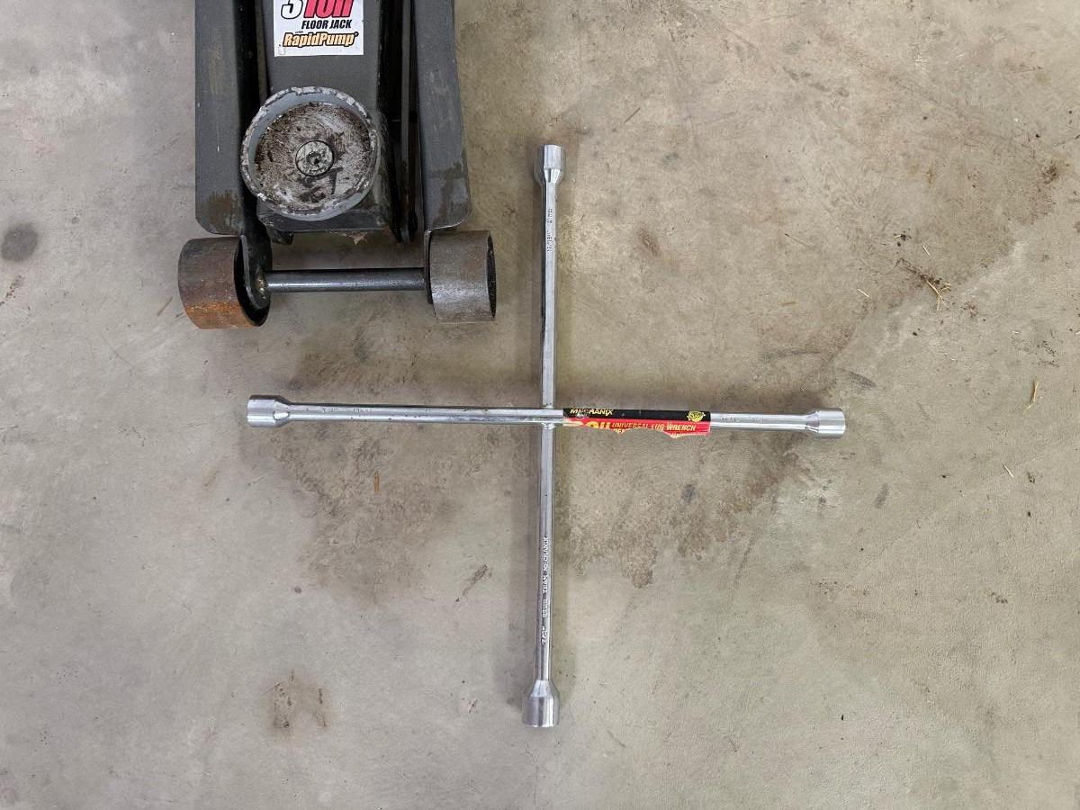 3 TON FLOOR JACK AND A 4 WAY LUG WRENCH