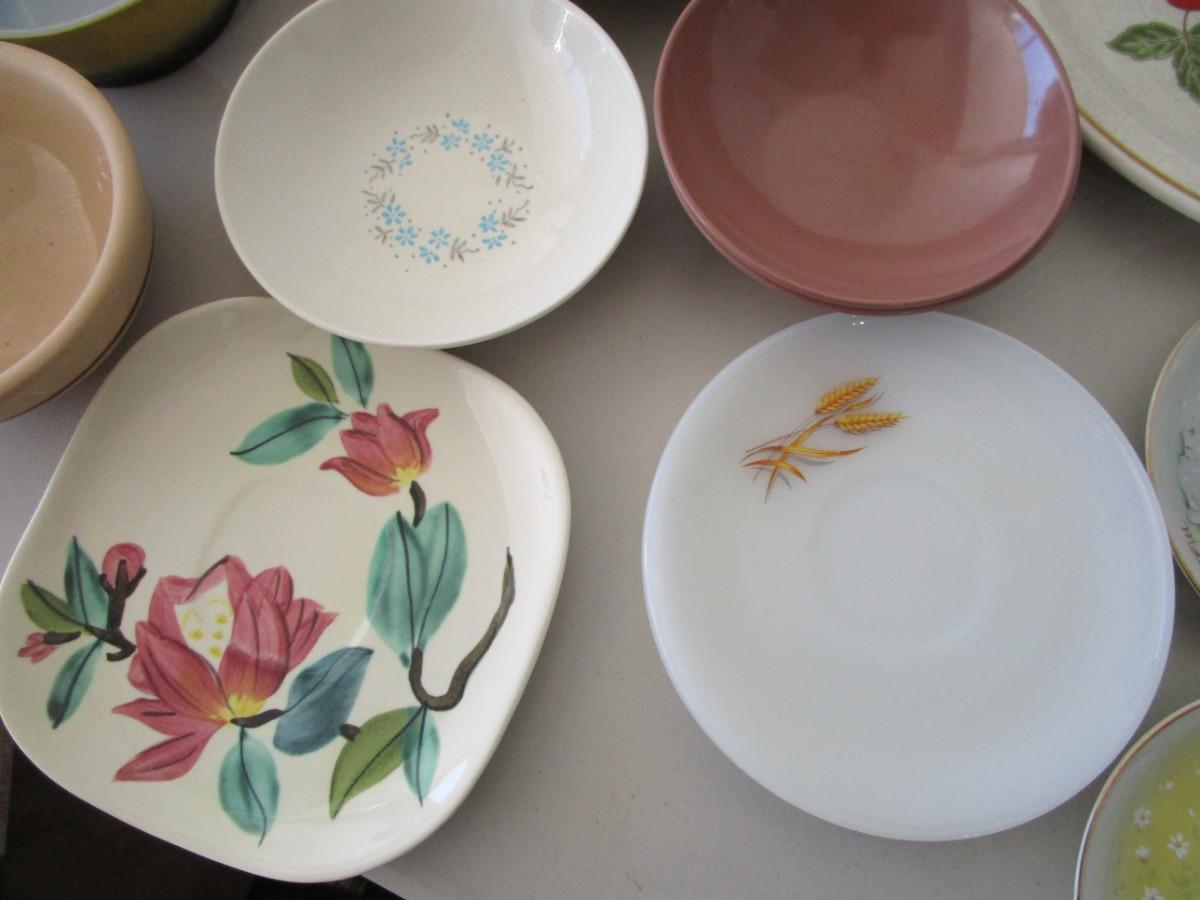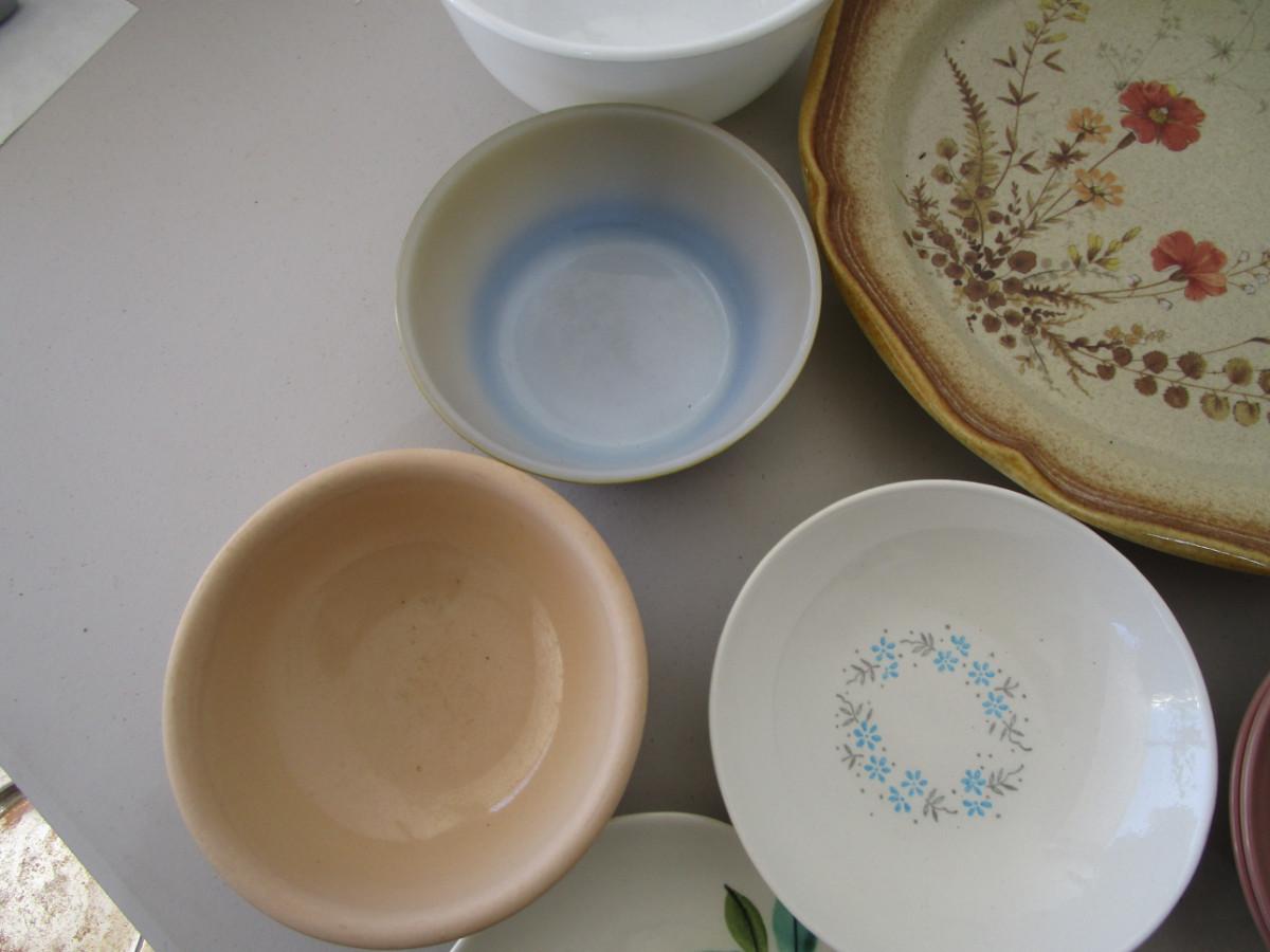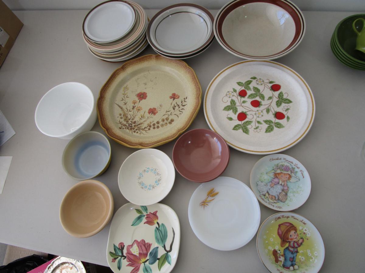 2 dinner plates, 8 salad plates, 6 saucers, 1 lg bowl, 2 cereal bowls, Corelle bowl, 5 dessert dishes
