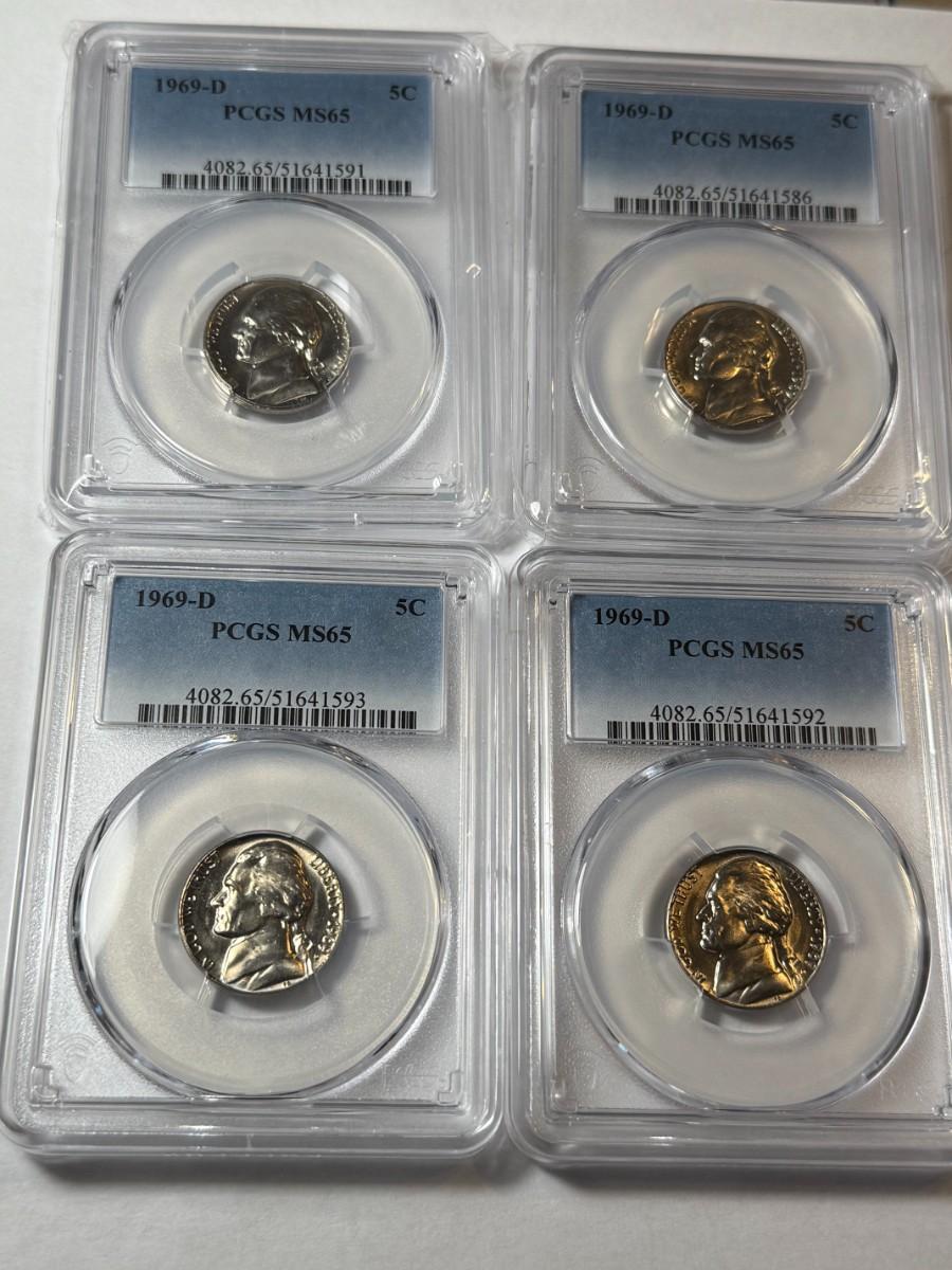 (4) PCGS CERTIFIED 1969-D MS65 CHOICE CONDITION JEFFERSON NICKEL LOT AS PICTURED. $5 DOMESTIC SHIPPING.