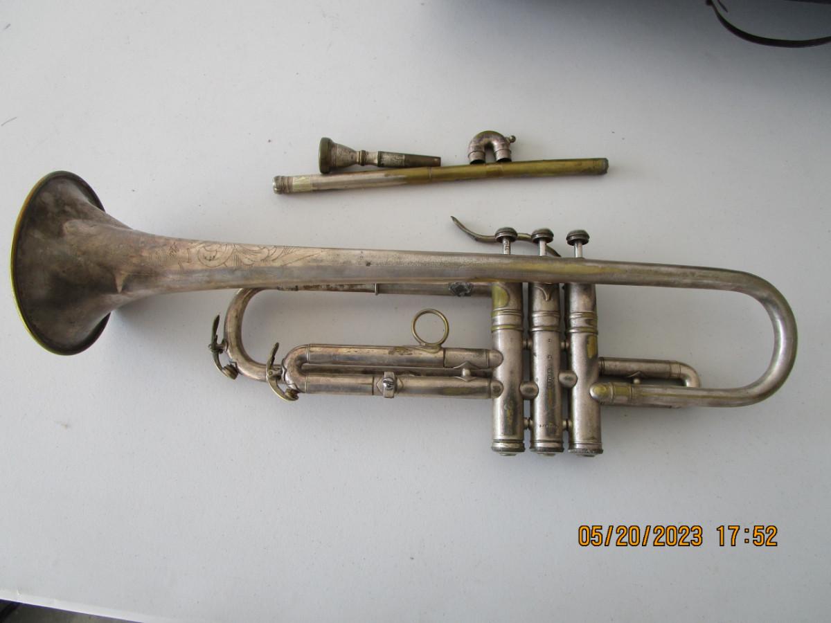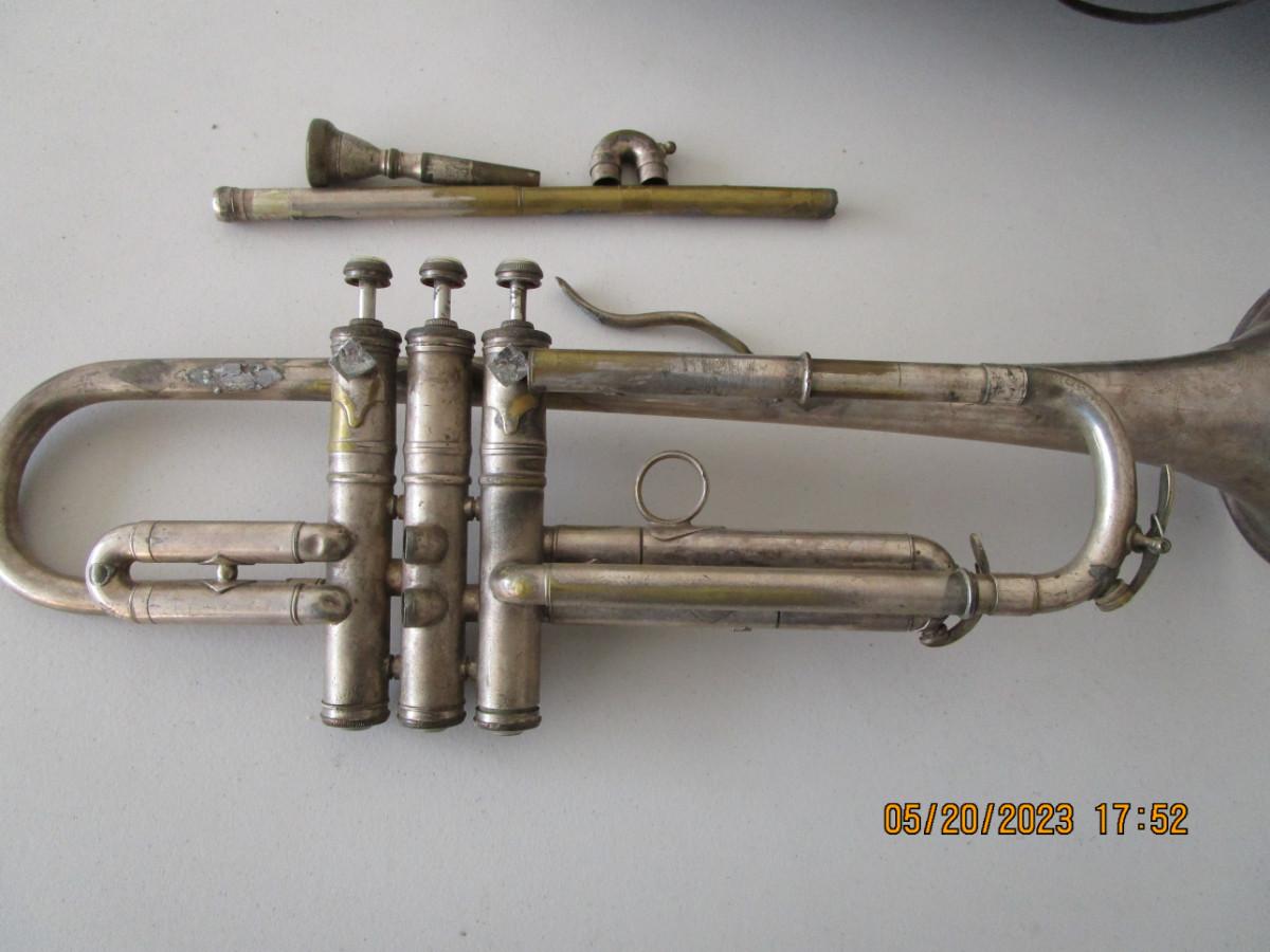 #49 Vintage Conn Trumpet, silver tone, with case, needs repair