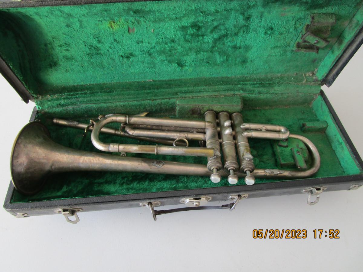 Vintage Conn Trumpet, silver tone, with case, needs repair