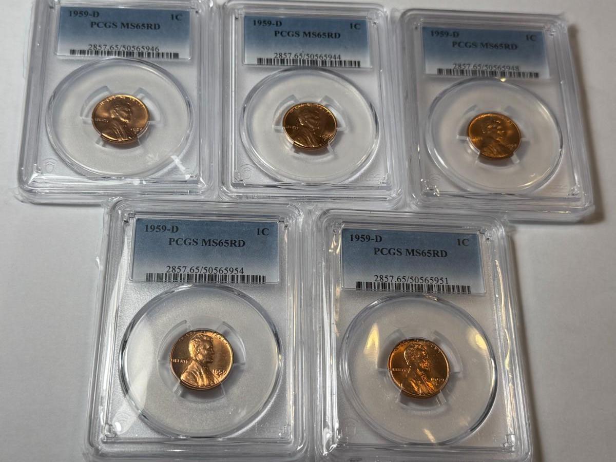 (5) PCGS CERTIFIED 1959-D MS65 RED CHOICE CONDITION LINCOLN CENT LOT AS PICTURED.