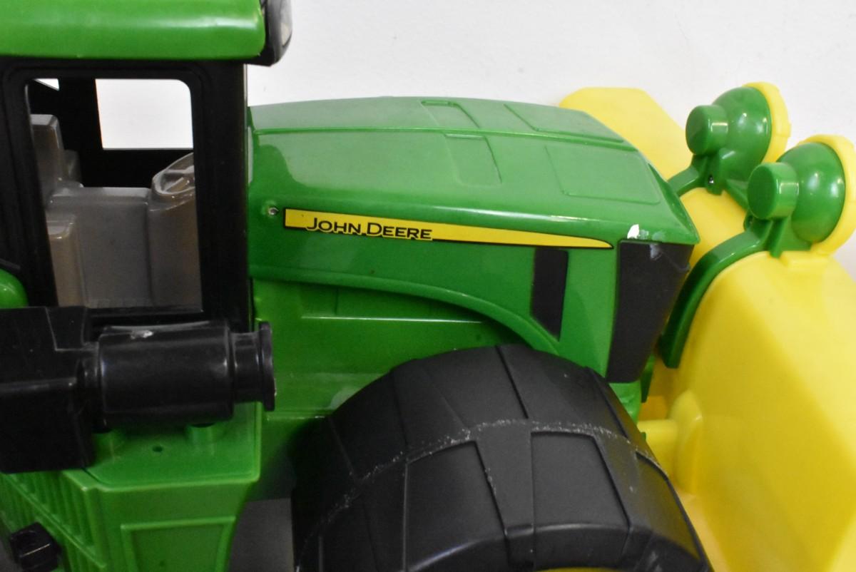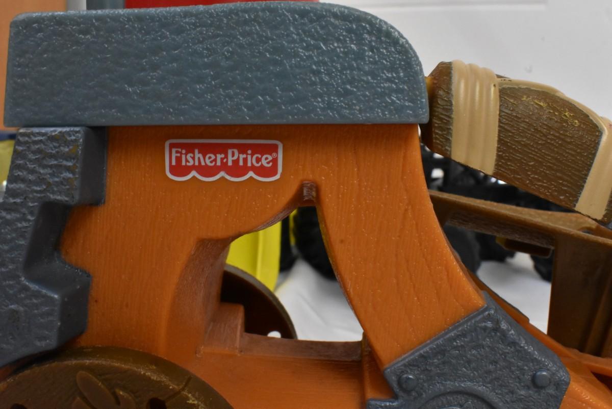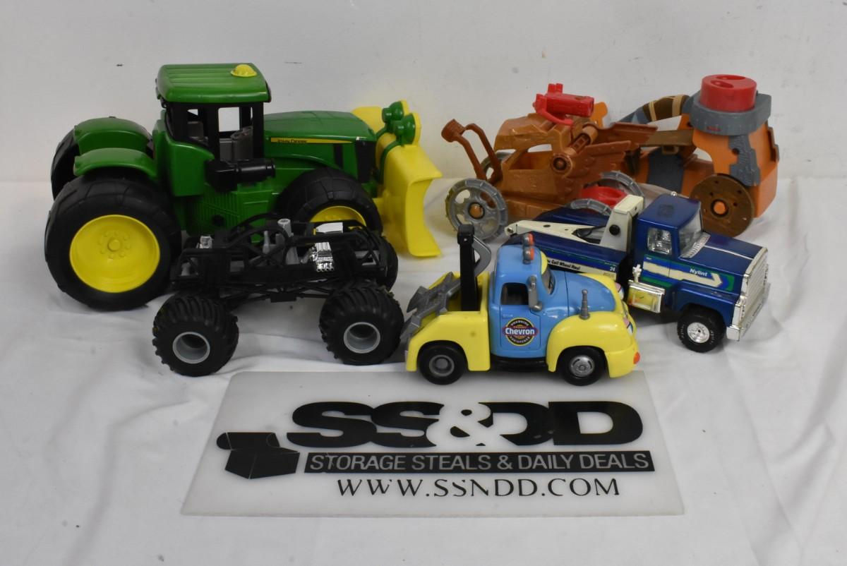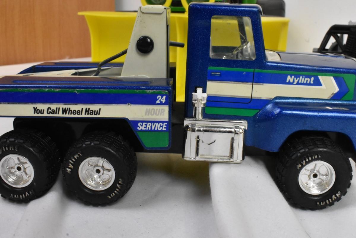 6 pc Toy truck lot: Tomy John Deere tractor, Fisher Price, Nylint metal tow truck