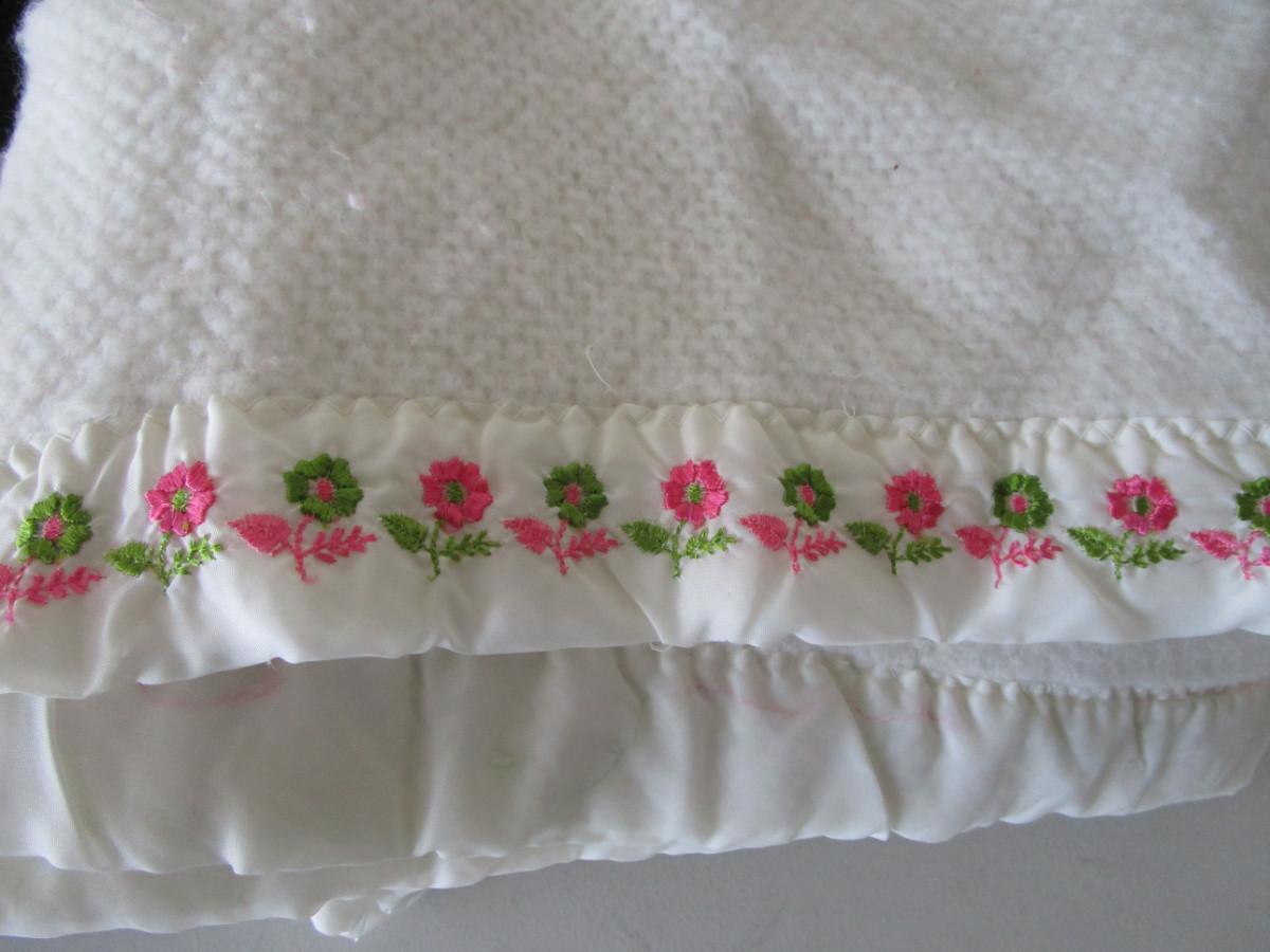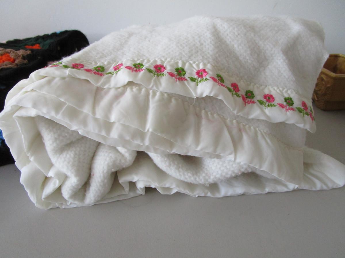 #61 Homemade Afghan and White Blanket with embroidered flowers at the top