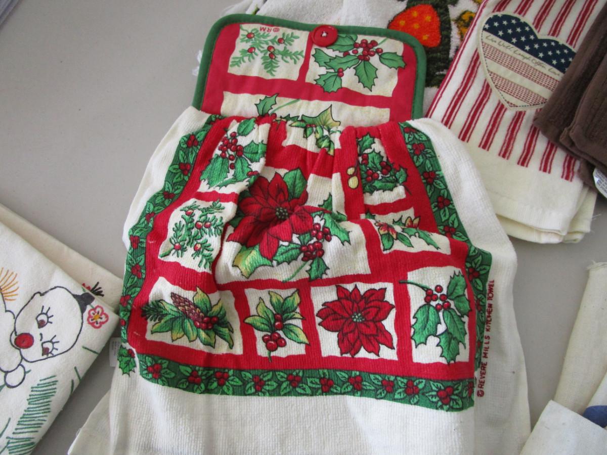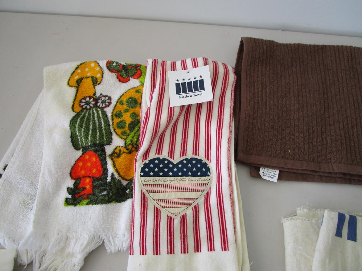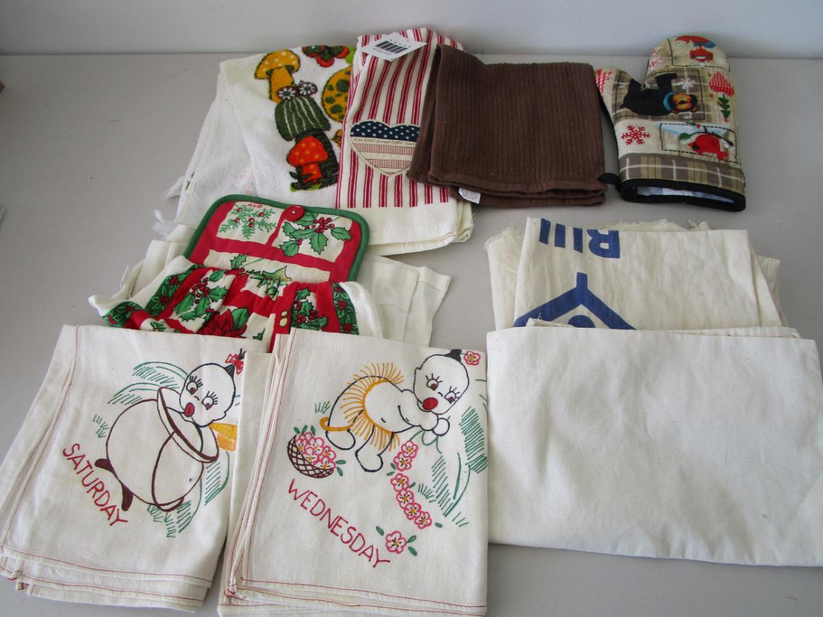 new and vintage dish towels, oven mitt, bag 12" x 15.5", bag 19" x 31"
