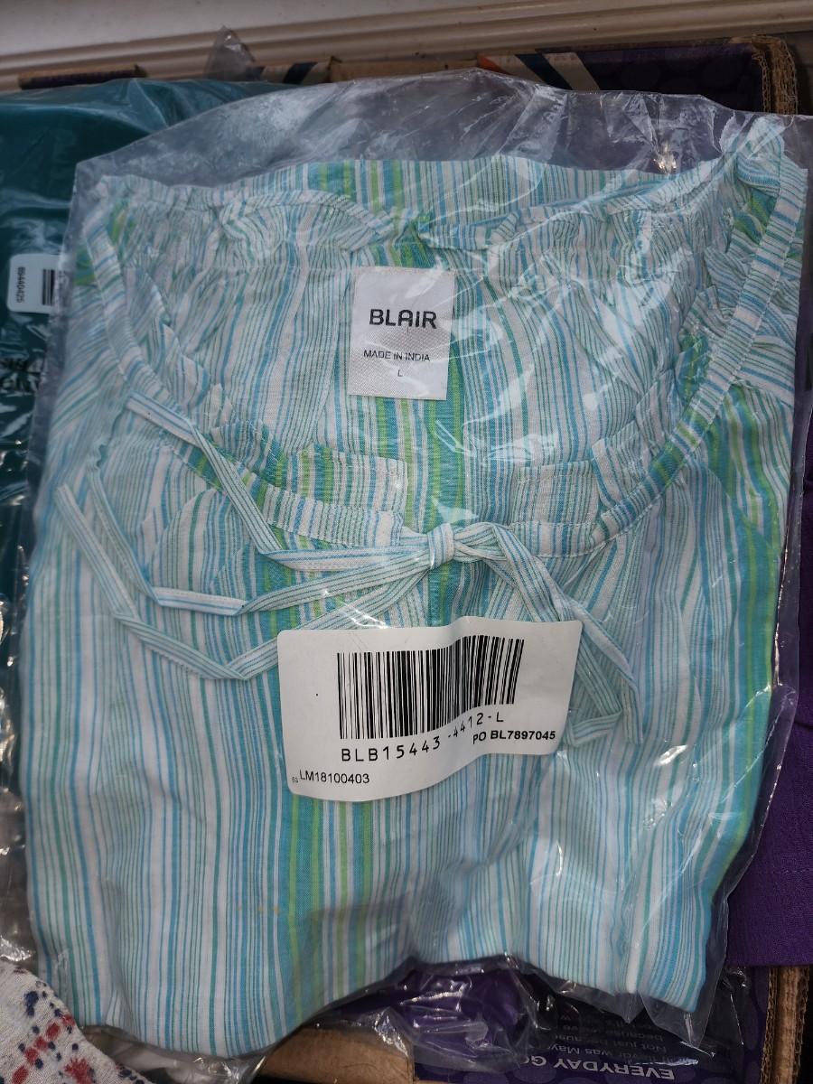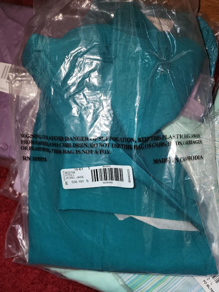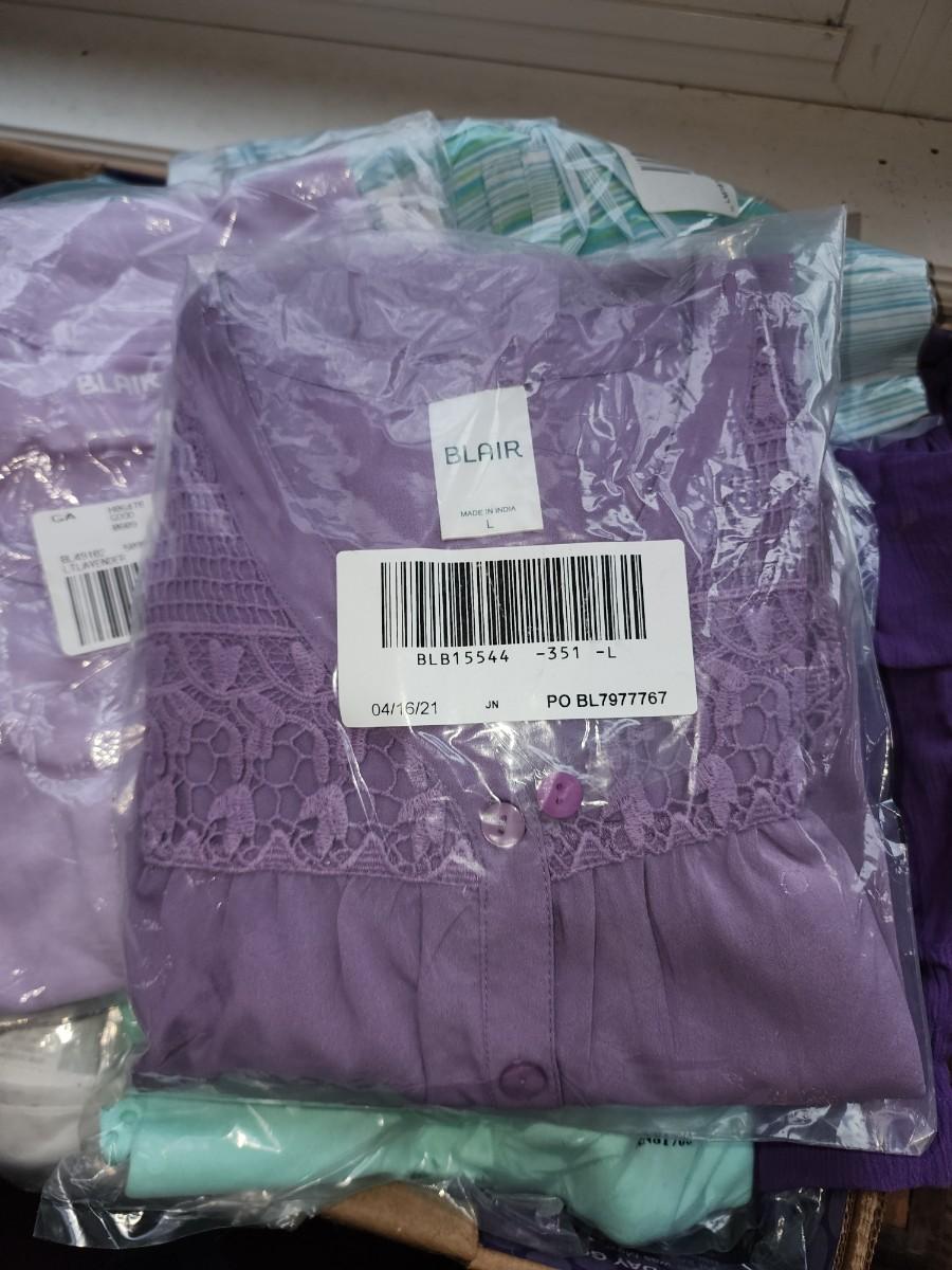 All size large. Purple and teal colors. Several tops. Some slacks and one skirt. Couple sweaters. All would be great mix and match